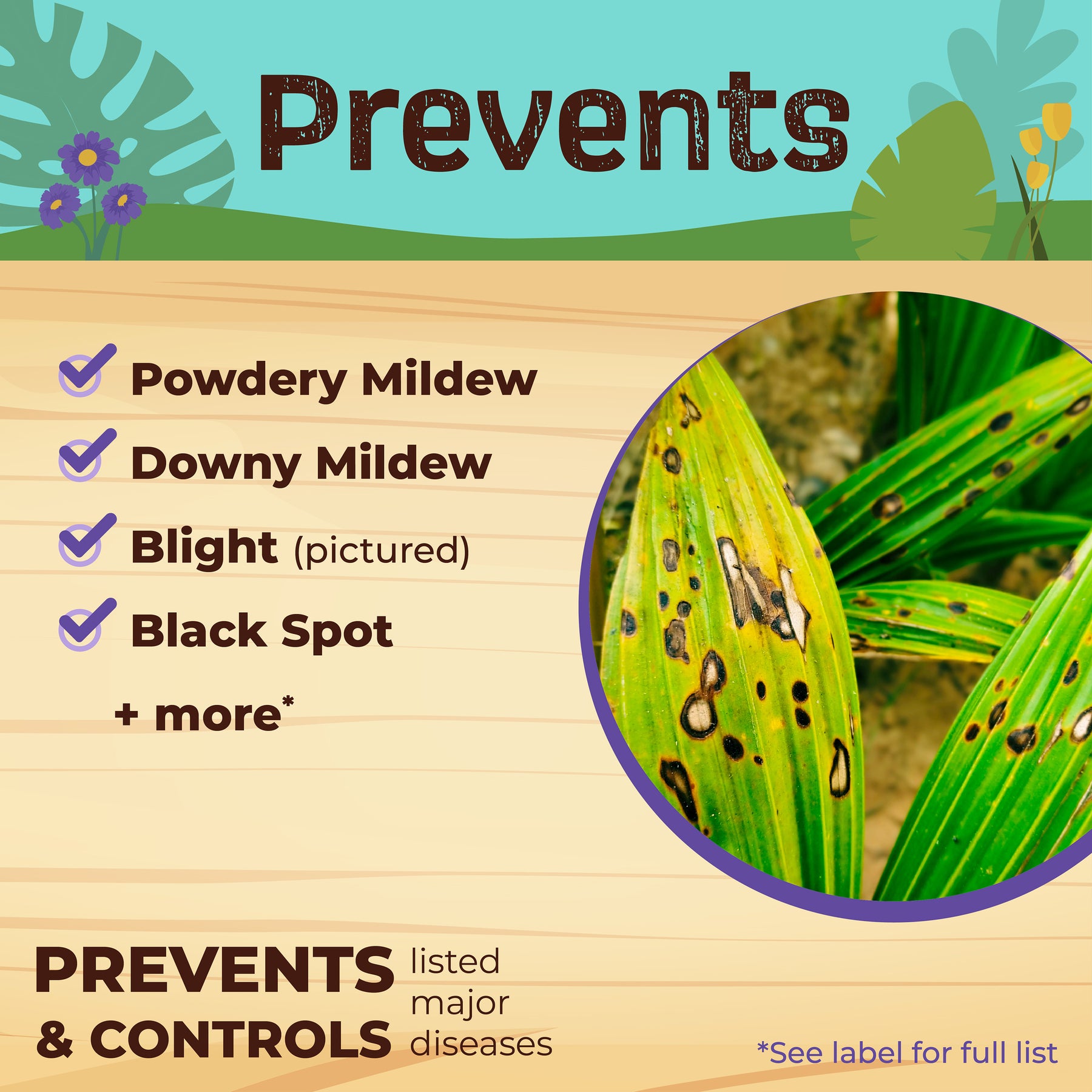 • Broad Disease Control: Targets powdery mildew, downy mildew, blight, black spot, peach leaf curl, and more