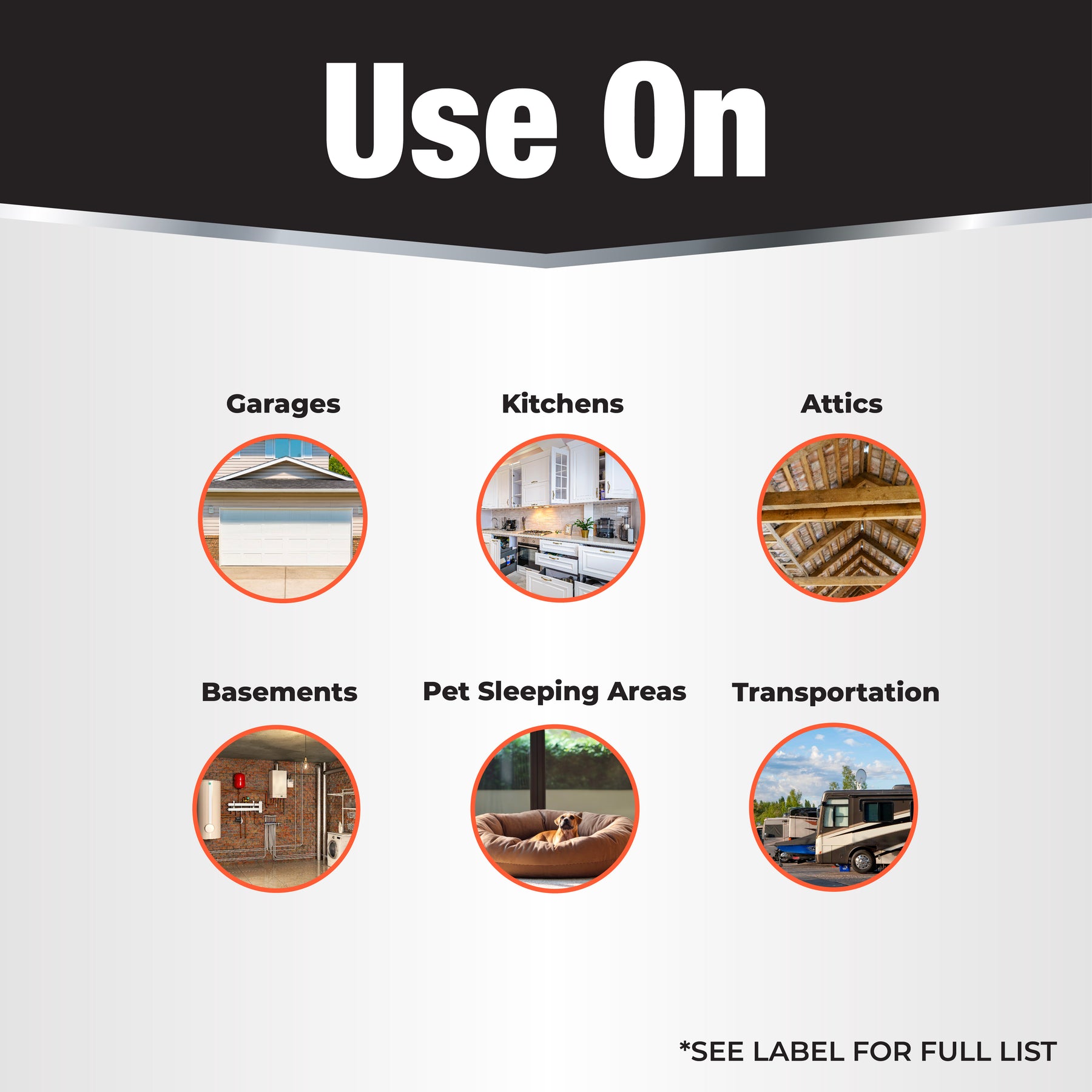 A: For indoor and outdoor use on areas like garages, kitchens, attics, basements, pet sleeping areas, and transportation—always follow the label for specific sites.