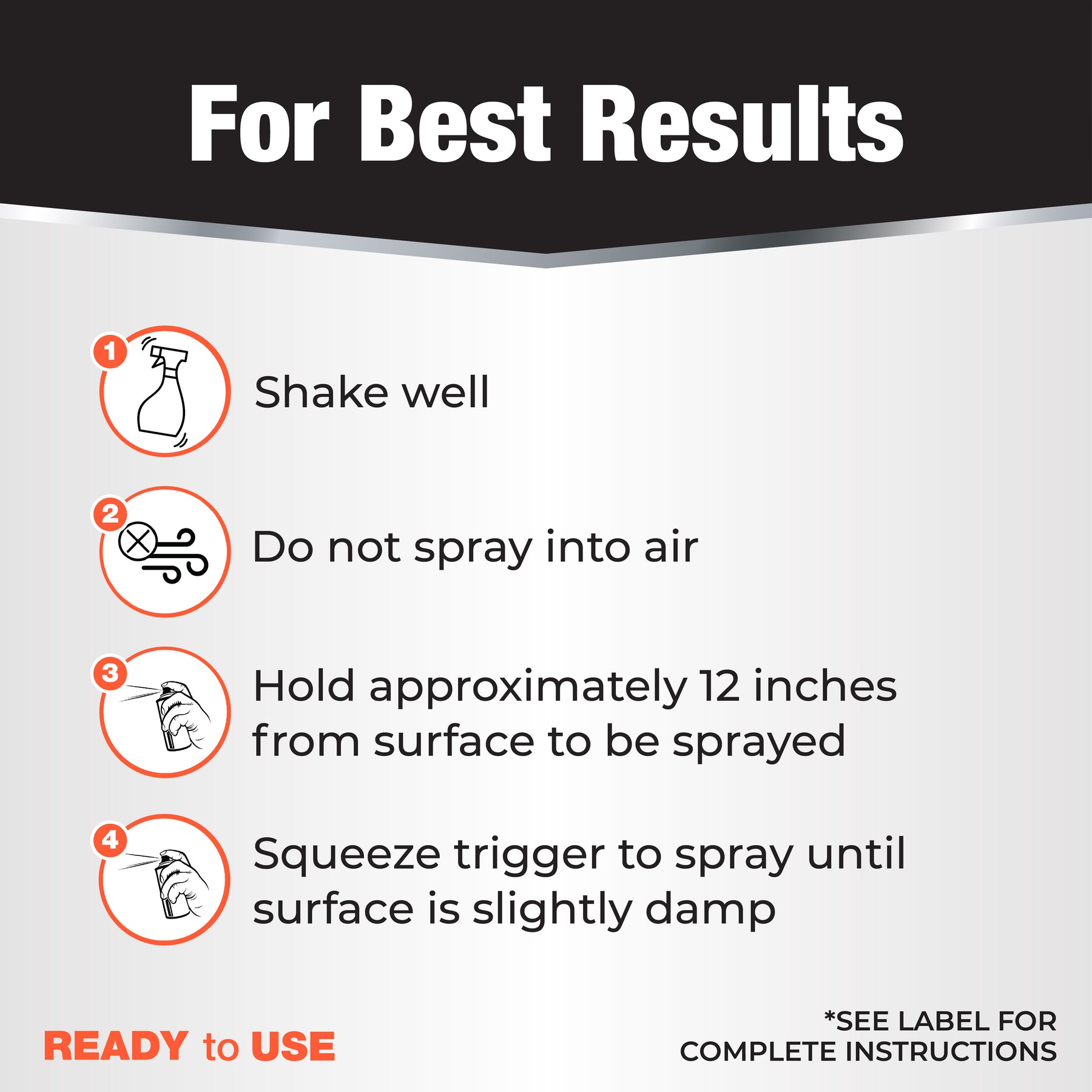 Usage Instructions (summary) Shake well; do not spray into air; hold ~12 inches from surface; spray until surface is slightly damp