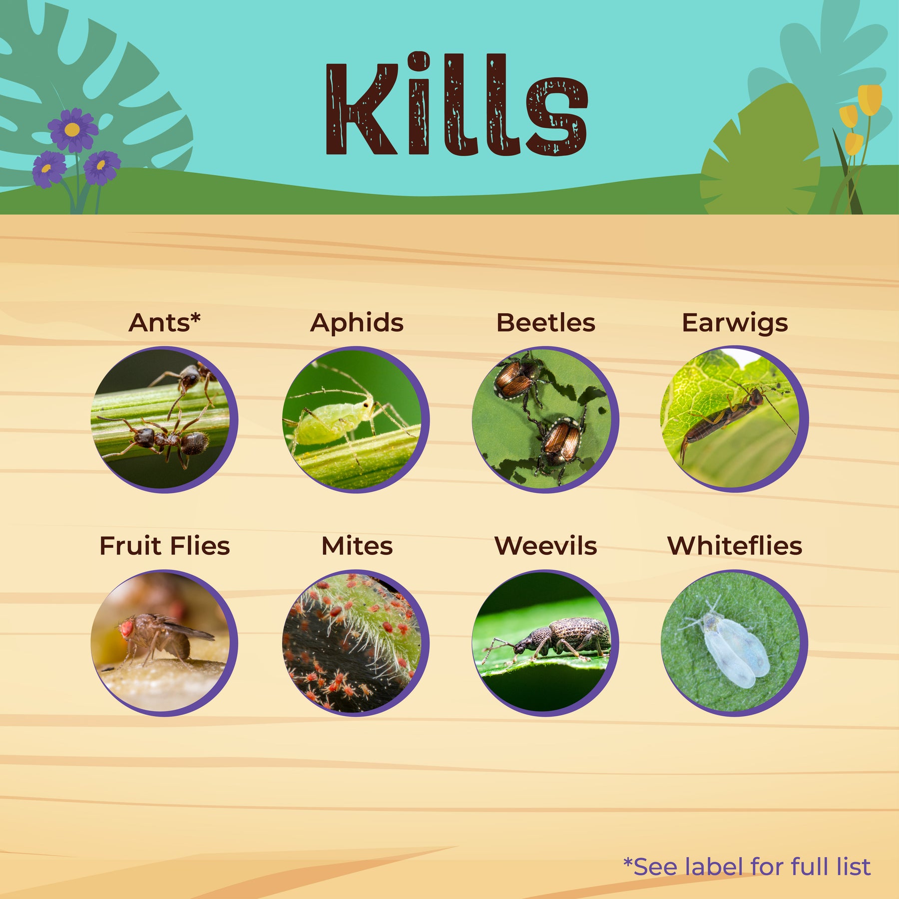 Controls Insects Aphids, mites, ants, whiteflies, fruit flies, beetles, earwigs, weevils, and more (see label)
