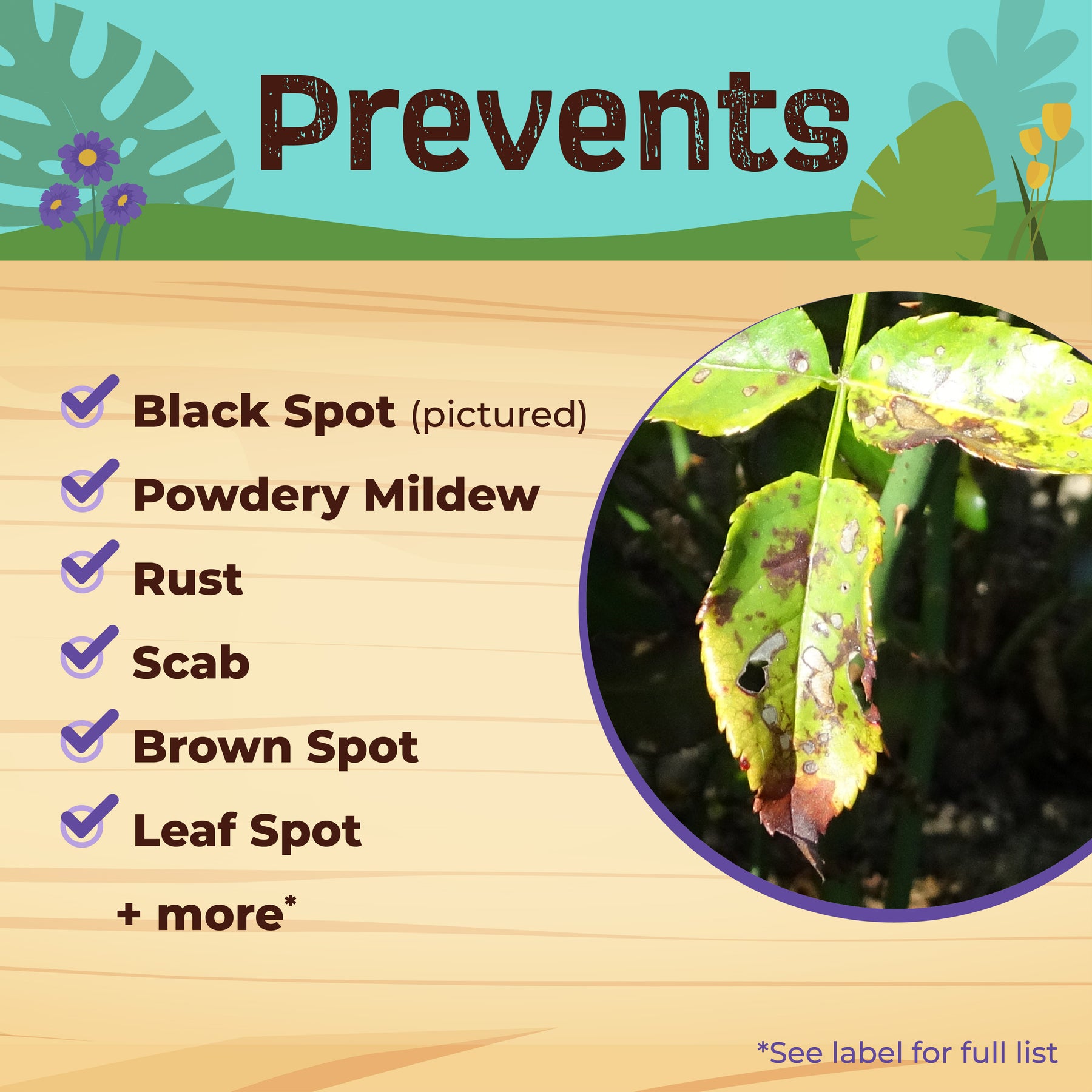 Controls Diseases Black spot, powdery mildew, rust, scab, brown spot, leaf spot, blight, and more (see label)