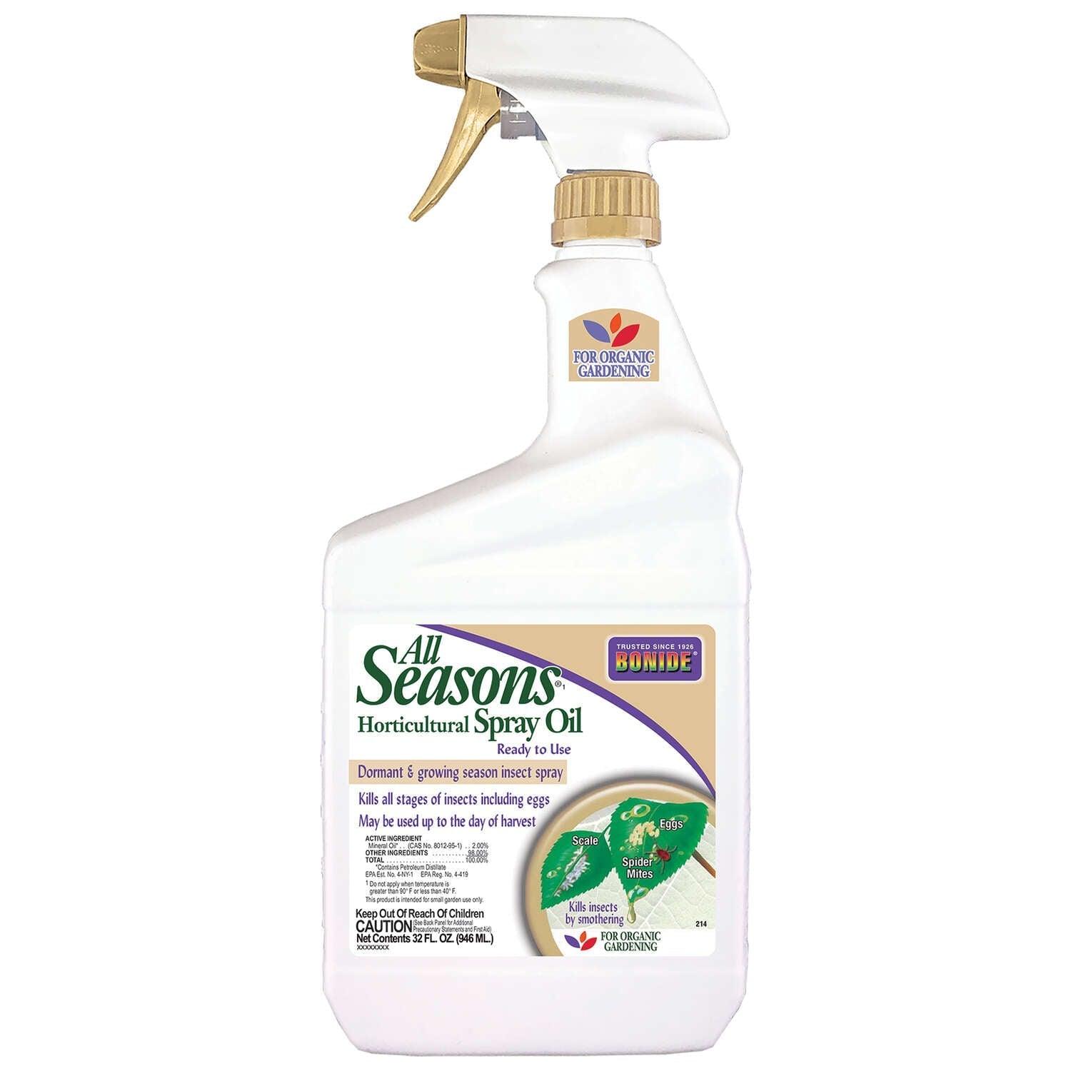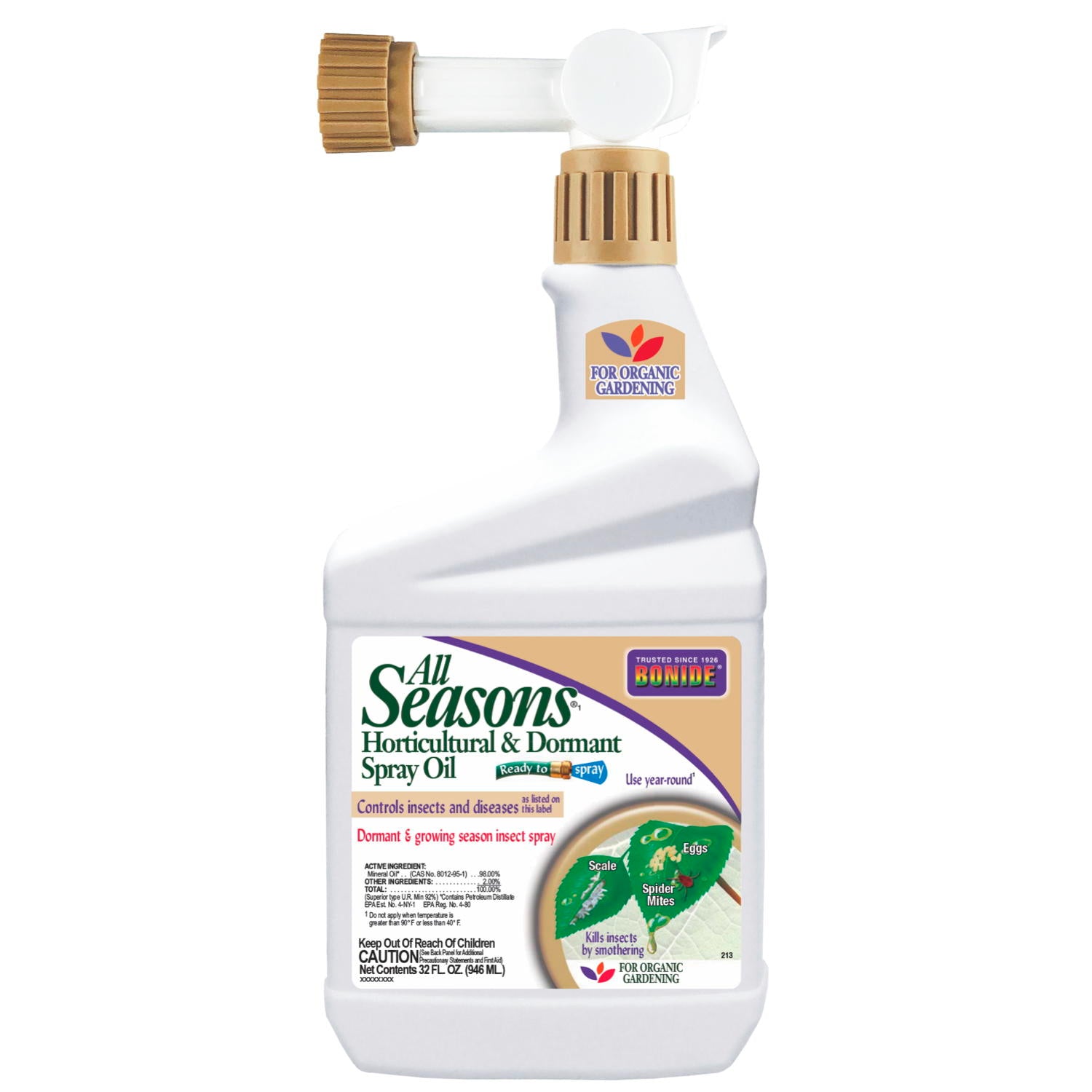 Bonide’s All Seasons Horticultural & Dormant Spray Oil controls insects and diseases by suffocation and is approved for organic gardening. This ready-to-spray quart treats flowers, fruit trees, ornamentals, roses, shade trees, shrubs, and vegetables throughout both dormant and growing seasons.