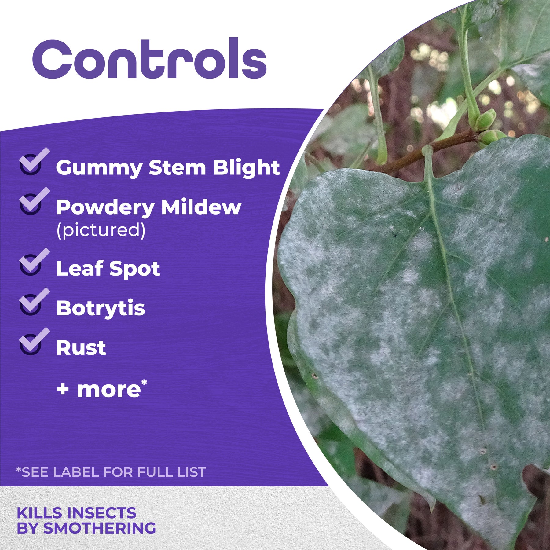 A year-round horticultural and dormant spray oil concentrate for organic gardening. Formulated with refined paraffinic oil, it controls listed insects and diseases on fruit trees, ornamentals, roses, shrubs, vegetables, and more by smothering pests and their overwintering eggs.