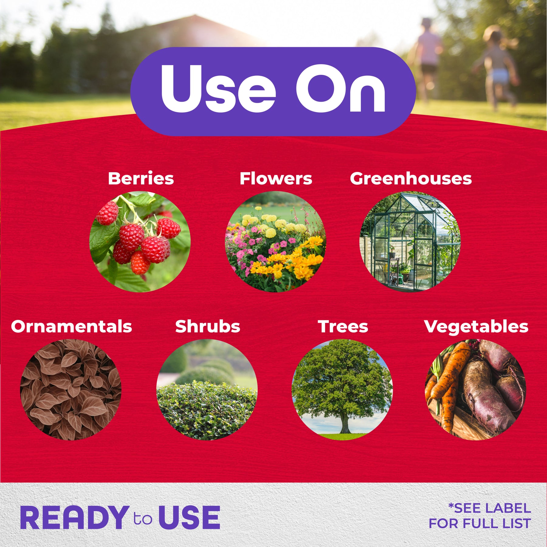 Ready-to-use insecticidal soap for indoor/outdoor plants that kills common pests in minutes. Approved for organic gardening, this contact spray is ideal for use on vegetables, fruits, ornamentals, shrubs, trees, and greenhouse plants.