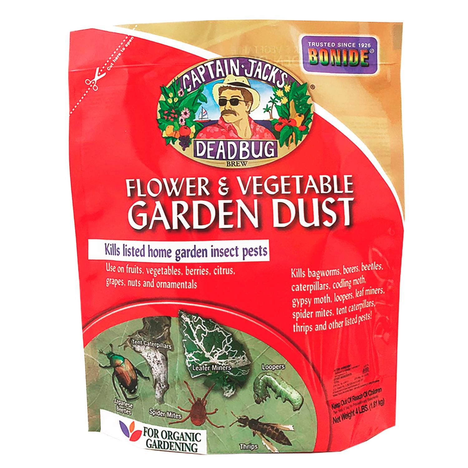 An easy-to-apply garden dust powered by Spinosad to control listed insects on edibles and ornamentals. Approved for organic gardening, this 4 lb dust applicator kills bagworms, beetles, caterpillars, mites, thrips, leaf miners and more, and can be used up to the day before harvest on listed crops.