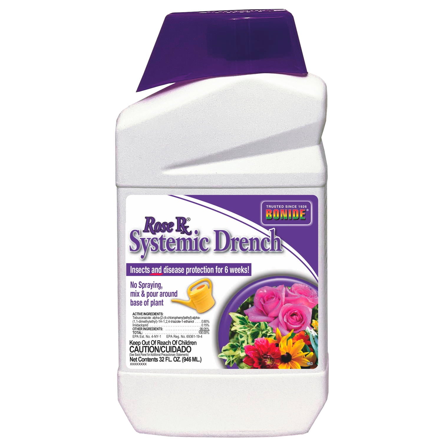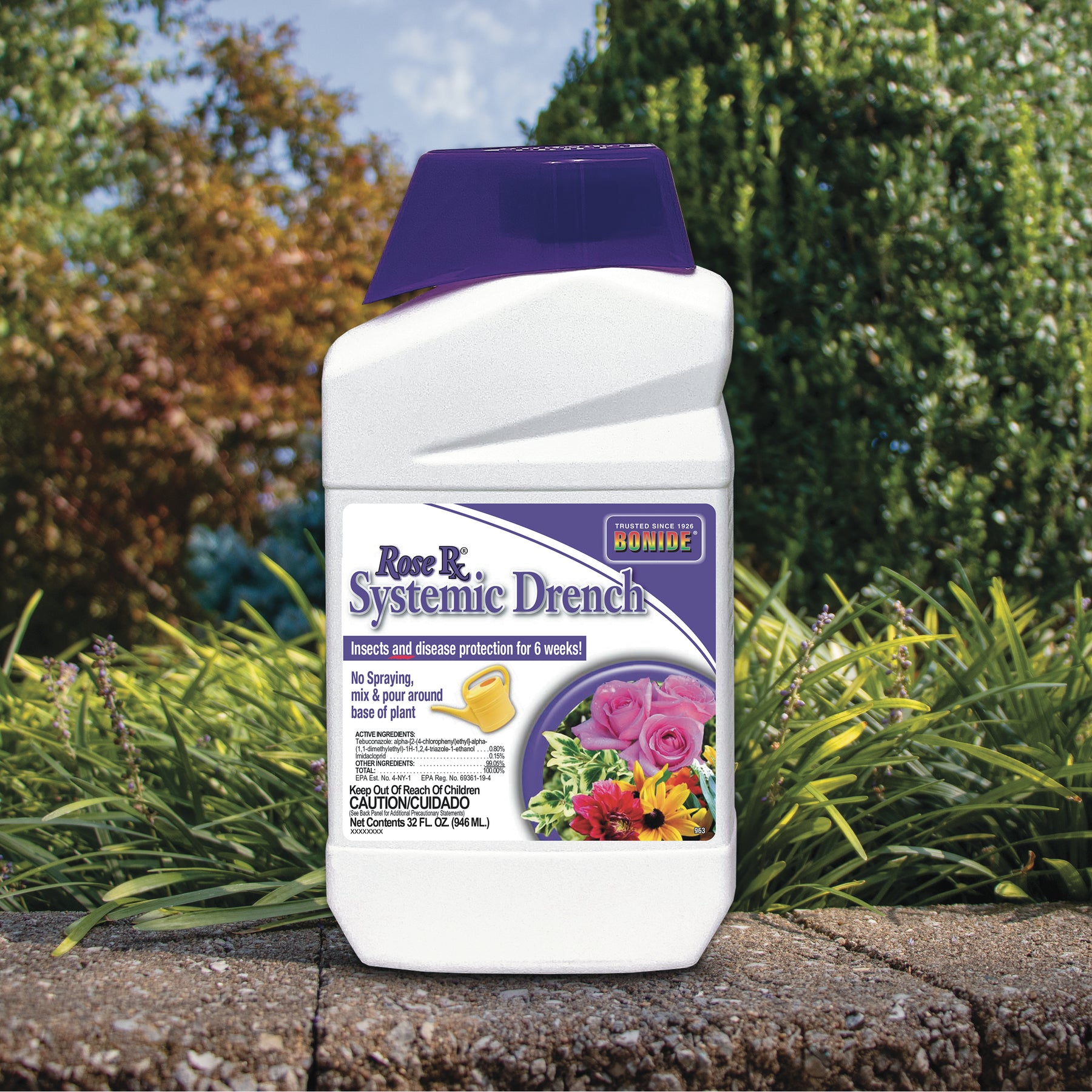 Bonide Rose Rx Systemic Drench delivers up to 6 weeks of insect and disease protection for roses, flowers, and ornamentals. This easy, no-spray liquid concentrate is mixed and poured at the base of plants to control pests like aphids and Japanese beetles while preventing black spot and powdery mildew.