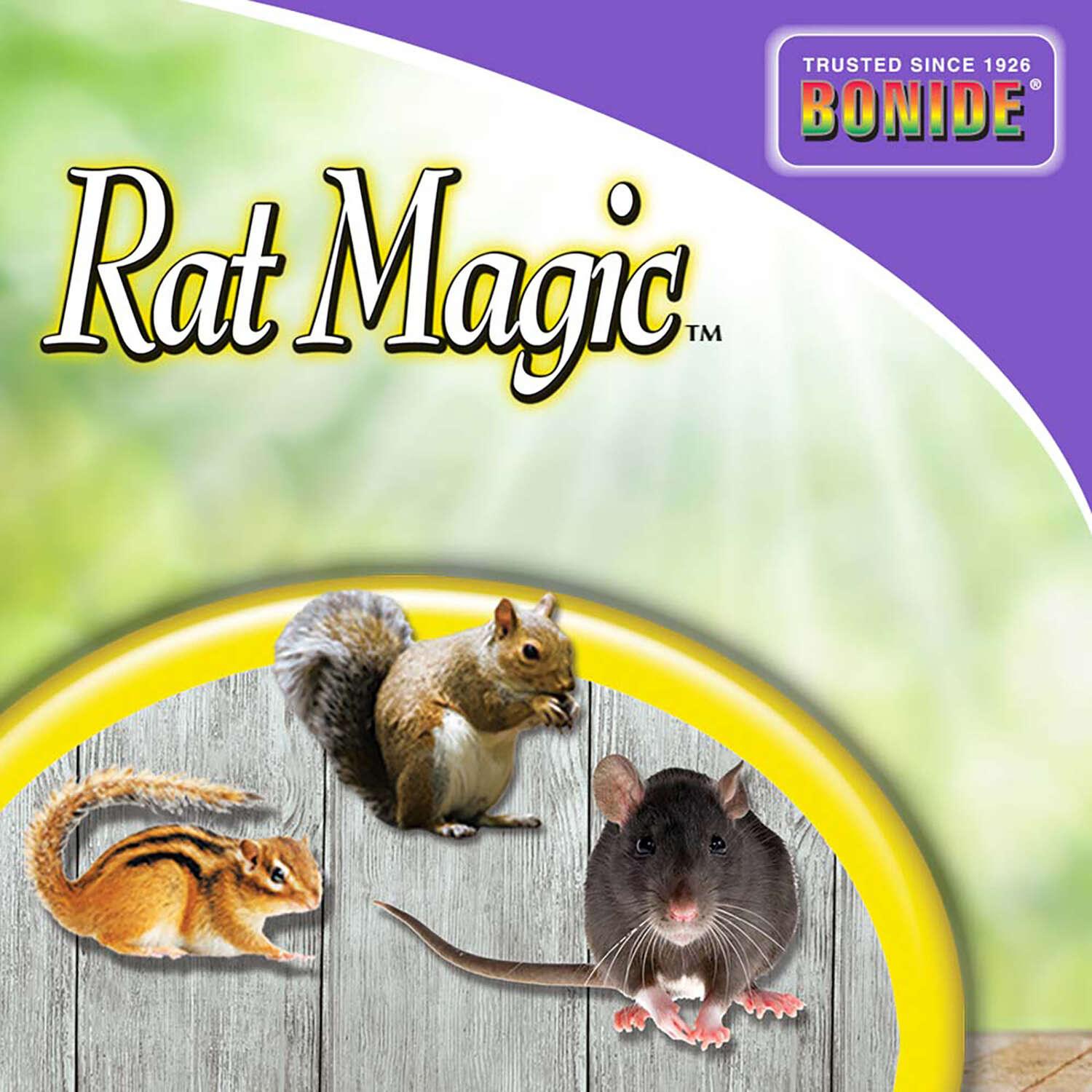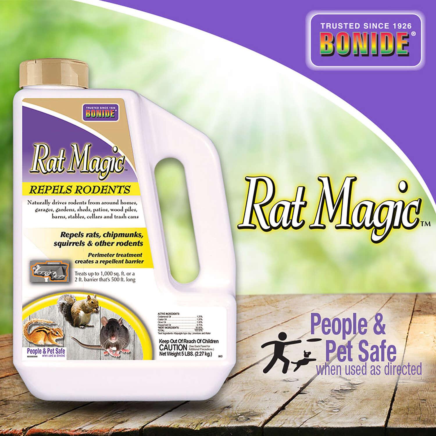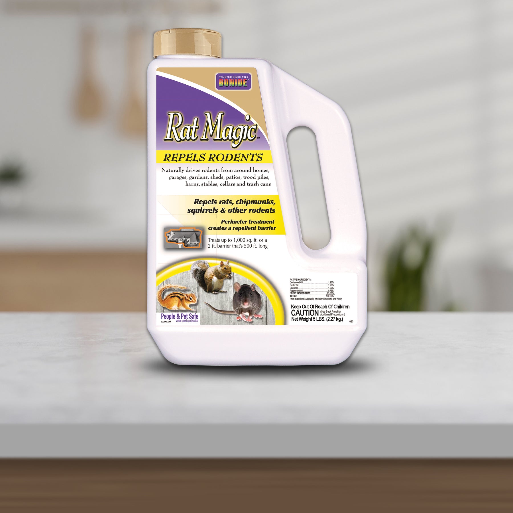 Bonide Rat Magic uses a powerful blend of essential oils to repel rats and other listed rodents from outdoor areas. The ready-to-use 5 lb shaker treats up to 1,000 sq. ft. and is people and pet safe when used as directed, ideal for creating a perimeter around buildings, gardens, and sheds.