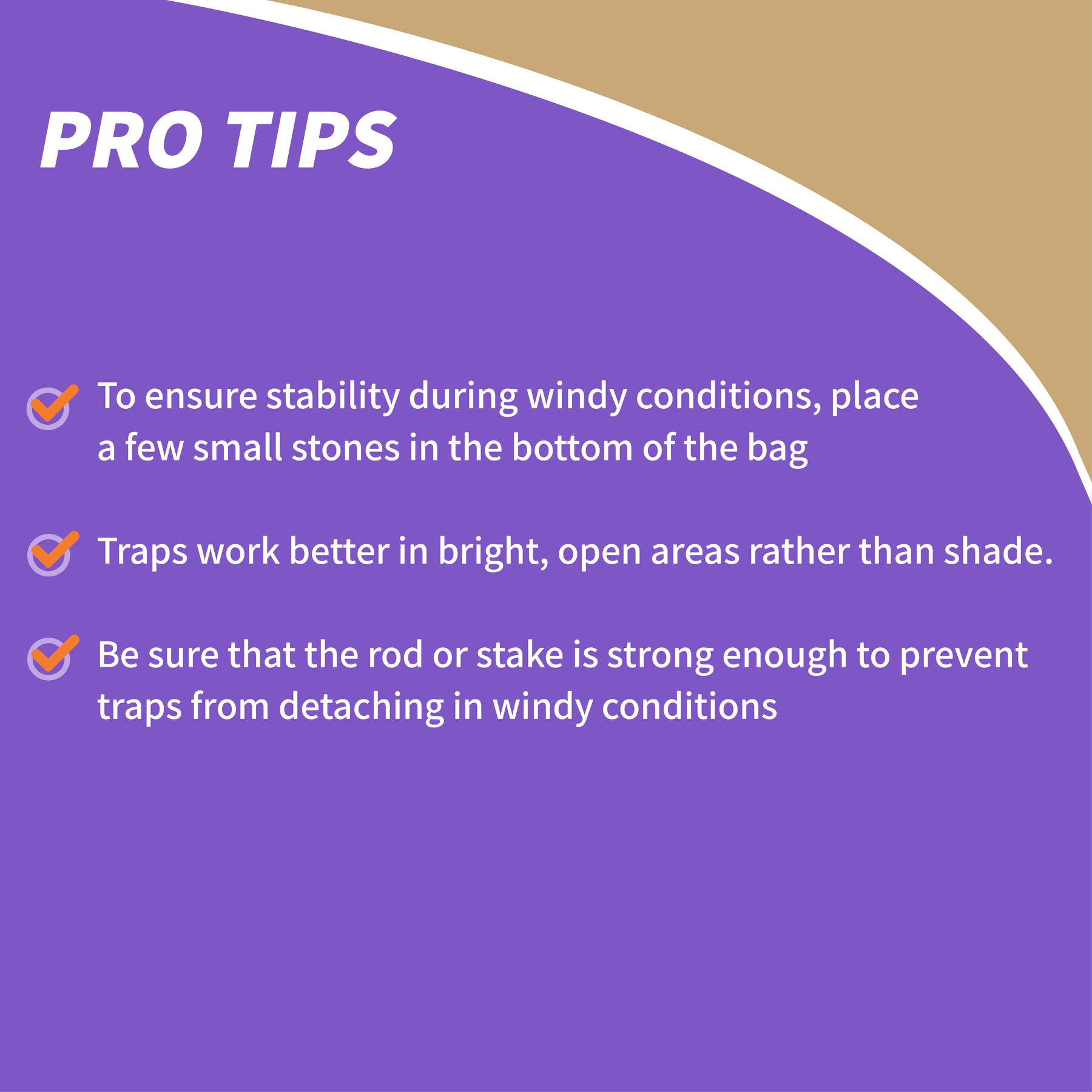 A: Traps work better in bright, open areas rather than shaded spots; ensure the stake or rod is sturdy, and add small stones to the bag bottom for wind stability.