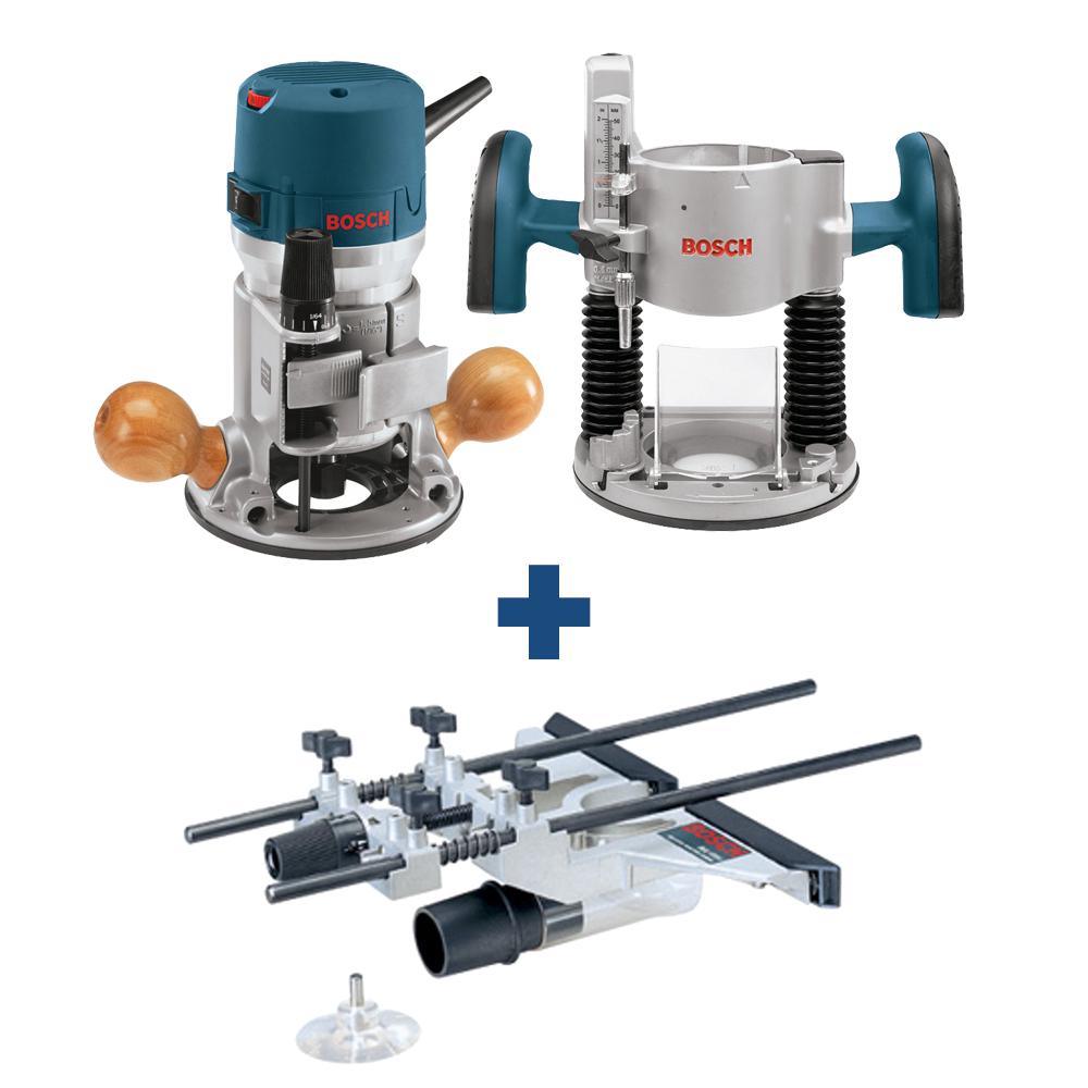 The Bosch 1617EVSPK 2.25 HP Plunge and Fixed-Base Router Kit is a versatile kit for a broad range of applications, including precise bit plunging, edge forming, slot cutting, laminate trimming and dovetail cutting. You can also use it with a router table. The kit features a 25,000 RPM, 12 Amp motor that delivers the power needed for smooth routing. Includes bonus RA1054 Deluxe Router Edge Guide. The Bosch Deluxe Router Edge Guide greatly expands the versatility of Bosch routers. It makes it possible to do edge-forming using non-piloted bits and guides cuts along the workpiece edge or up to 8 in. from the edge. Featured equipment includes a dust extraction hood and vacuum hose adapter that allows connection to 1-1/4 in., 1-1/2 in. and 35 mm hoses. The edge guide also includes a pivot plate and can be easily converted into a circle guide for making circles and arcs up to 32 in. Dia.