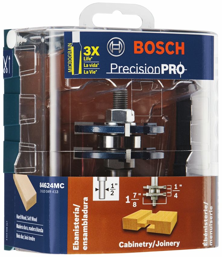 Micrograin carbide-tip router bit design – ensures consistently smooth finish cuts, with superior wear resistance Micrograin bit – designed to cut tongue and grooves on 1/2 In. through 3/4 In. thick material Modify to cut groove – full assembly used to cut the tongue; remove one slot cutter to cut the groove Reinforced shanks – feature fully hardened and tempered steel shanks that provide ultimate durability Upgraded micrograin carbide – engineered for precise cuts and for long bit life Bosch-exclusive heat-treating process – provides hardness and withstands high temperatures Comprehensive line of bits – features hundreds of profiles for mortising, edge forming, trimming, surface forming, and cabinetry/joinery in wood, plastic and laminate