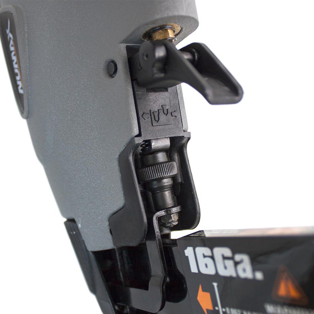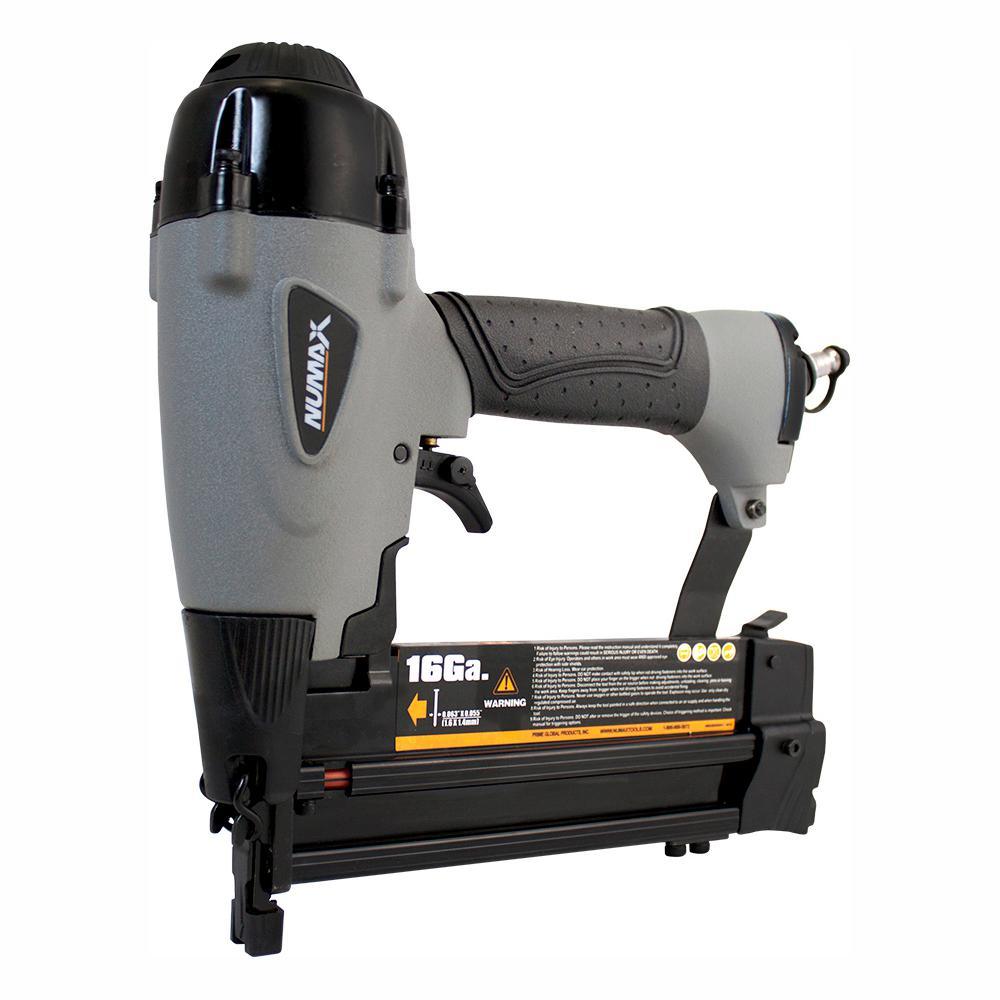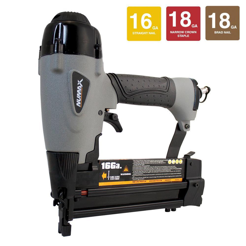 The NuMax SXL31 Pneumatic 3-in-1 16-Gauge and 18-Gauge 2-1/2 in. Finish Nailer, Brad Nailer and Stapler is designed for home improvement applications such as cabinetry, crown moulding, and furniture, and is also great for hobbies and crafts. This versatile air powered tool is compatible with 16-Gauge straight finish nails from 3/4 in. to 2-1/2 in., 18-Gauge brad nails from 5/8 in. to 2 in., and 18-Gauge 1/4 in. narrow crown staples from 5/8 in. to 1-5/8 in. A quick jam release provides easy access clearing in the event of a jammed fastener, and a tool-free finger depth adjust for various applications also helps save time and increase productivity. Other features of this finishing nail gun and stapler combo include a no mar tip to protect your work surface, an aluminum cylinder and magazine for lightweight and long lasting durability, a reload indicator to view remaining nails, and a 360° adjustable exhaust to direct air away from your face and debris. Air tool oil and adjustment tools are included. The Pneumatic 3-in-1 16-Gauge and 18-Gauge 2-1/2 in. Finish Nailer, Brad Nailer and Stapler will make finish work fast and easy for DIYers taking on home improvement and repair projects as well as professional contractors at the job site, and is covered by NuMax's 1- Year Limited Warranty and 30 Day Wearable Parts Warranty.