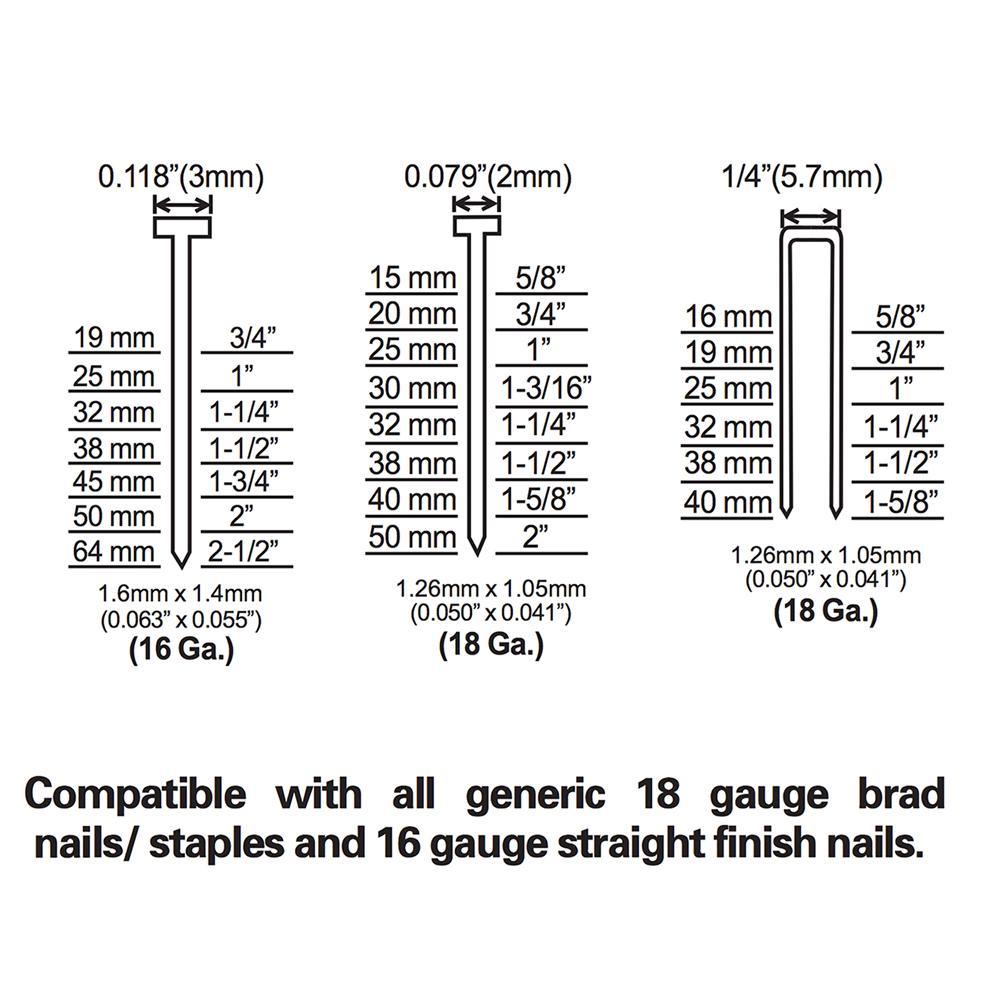 • Drives 16-Gauge finish nails, 18-Gauge brad nails and 18-Gauge narrow crown staples