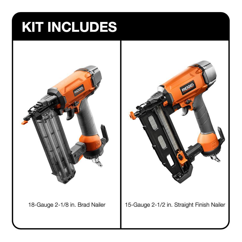 RIDGID introduces the 18-Gauge 2-1/8 in. Brad nailer and 16-Gauge 2-1/2 in. Straight Finish Nailer Kit. RIDGID pneumatic tools deliver unmatched performance, providing you with professional results, drive after drive. This kit with an 18-Gauge Brad nailer and 16-Gauge Finish Nailer provide you with most everything you need for your finish work. Powerful motors ensure our RIDGID tools sink flush into an array of different material types. Backed by the Industry Leading Lifetime Service Agreement, this kit includes the 18-Gauge 2-1/8 in. Brad nailer and 16-Gauge 2-1/2 in. Straight Finish Nailer.