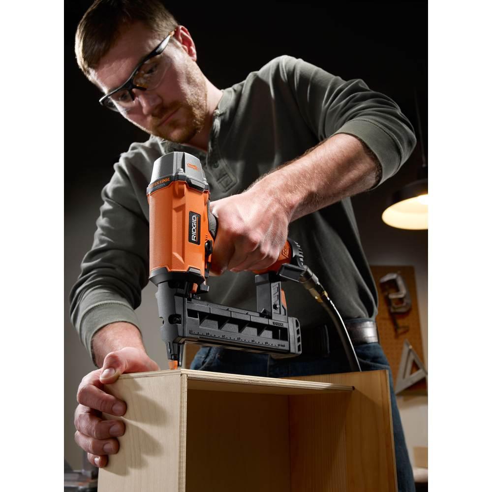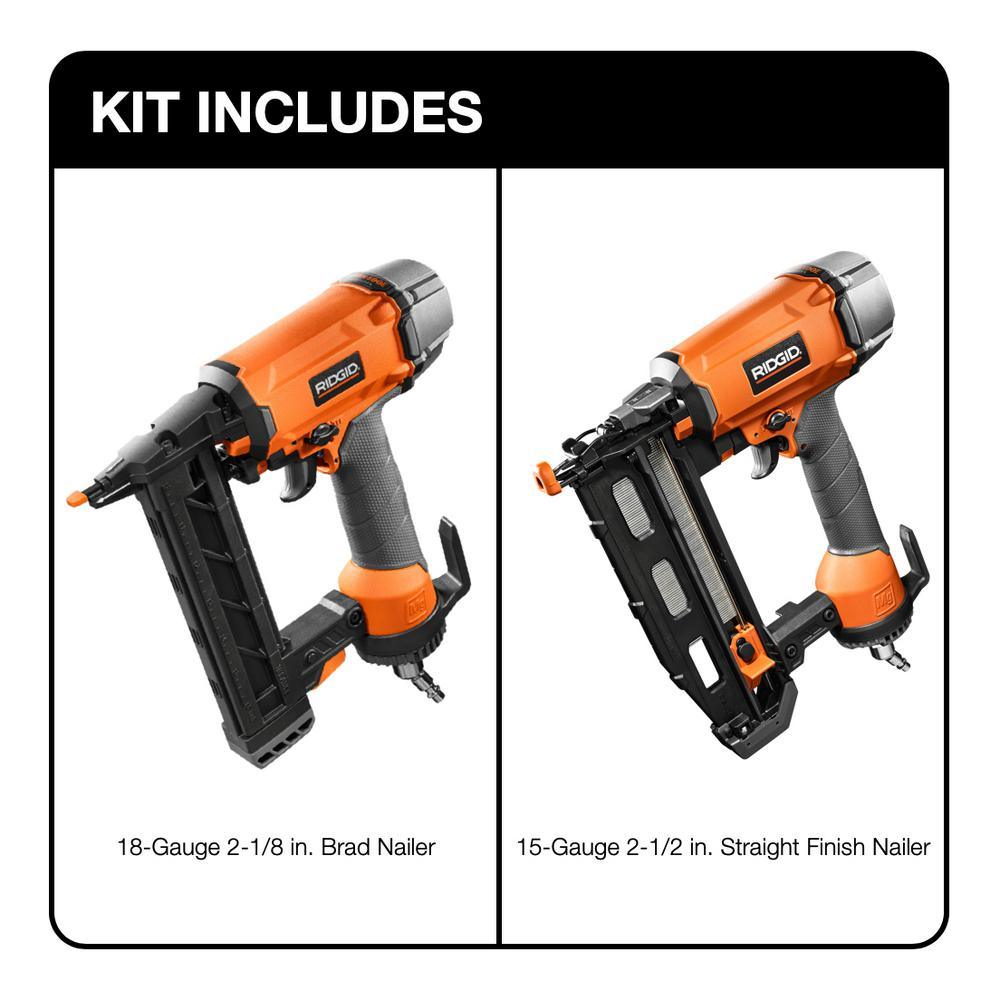RIDGID introduces the 18-Gauge 1-1/2 in. Finish Stapler and 18-Gauge 2-1/8 in. Brad Nailer Kit. The 18-Gauge 1-1/2 in. Finish Stapler features a magazine that allows a wide range of fastener diameters and the internal piston catch delivers consistent driving power. It is designed for clean operation and long life, and equipped with no-mar pads that help prevent scuffing or damage to the work surface. The 18-Gauge 2-1/8 in. Brad Nailer has Hex Grip overmolding, an oil-less motor, an ACCU-Drive tip design, and No-Mar Pads. It has a selectable trigger that can be set to contact or sequential fire. The magazine allows a wide range of fastener lengths and the internal piston catch delivers consistent driving power. It is designed for clean operation and long life and equipped with no-mar pads that help prevent scuffing or damage to the work surface. All of these features are backed by the RIDGID Industry Leading Lifetime Service Agreement. That means FREE Parts. FREE Service. For LIFE. This kit includes the 18-Gauge 1-1/2 in. Finish Stapler, the 18-Gauge 2-1/8 in. Brad Nailer, and an operator's manual.