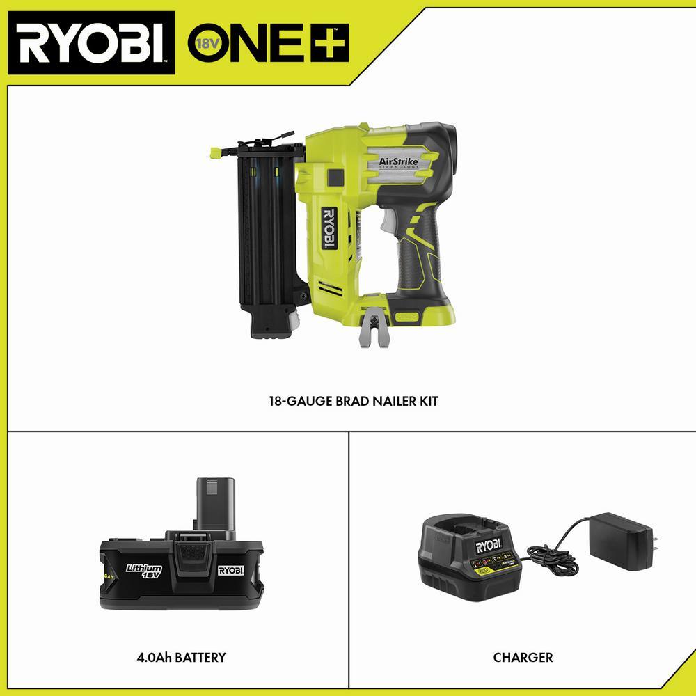 RYOBI introduces the 18V ONE+ Cordless AirStrike 18-Gauge Brad Nailer with Sample Nails, (1) 4.0 Ah Battery and Charger. This 18-gauge brad nailer features AirStrike Technology, which eliminates the need for noisy compressors, bulky hoses, or expensive gas cartridges. This means faster setup and easier maneuvering on the job site. The RYOBI P320 AirStrike Brad Nailer drives 18-Gauge nails from 5/8 in. to 2 in. long. The battery included in this kit delivers fade-free power which allow you to work stronger and longer when paired with any 18V ONE+ tool. The charger is compatible with all 18V ONE+ Lithium-Ion Batteries. Best of all, it is part of the RYOBI ONE+ System of over 175 cordless tools that all work on the same battery platform. Backed by the RYOBI 3-Year Manufacturer's Warranty, this nailer includes a belt clip, sample nails, and an operator's manual.