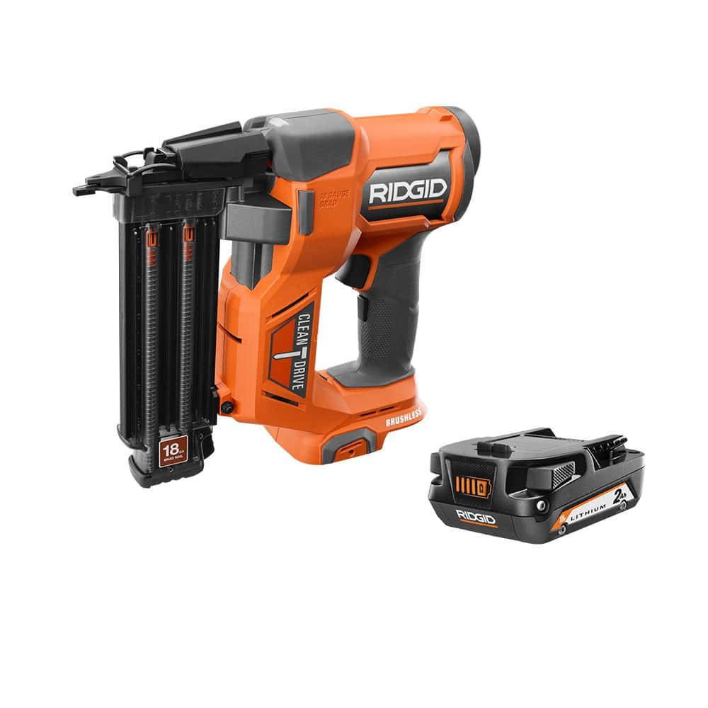 RIDGID 18V Brushless Cordless 18-Gauge 2-1/8 in. Brad Nailer with CLEAN DRIVE Technology with 18V 2.0 Ah Lithium-Ion Battery