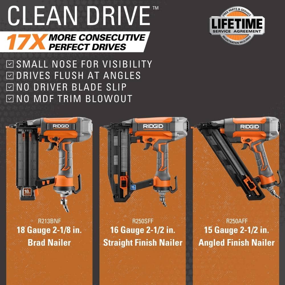 The RIDGID Pneumatic Nailer Combo Kit includes an 18-Gauge Brad Nailer and a 23-Gauge Headless Pin Nailer, each designed for precision and durability. With innovative CLEAN DRIVE Technology, these tools offer superior performance with fewer jams, enabling professionals and DIY enthusiasts to work efficiently in tight spaces. Enjoy peace of mind with RIDGID's Lifetime Service Agreement, ensuring your tools remain in top condition for life.