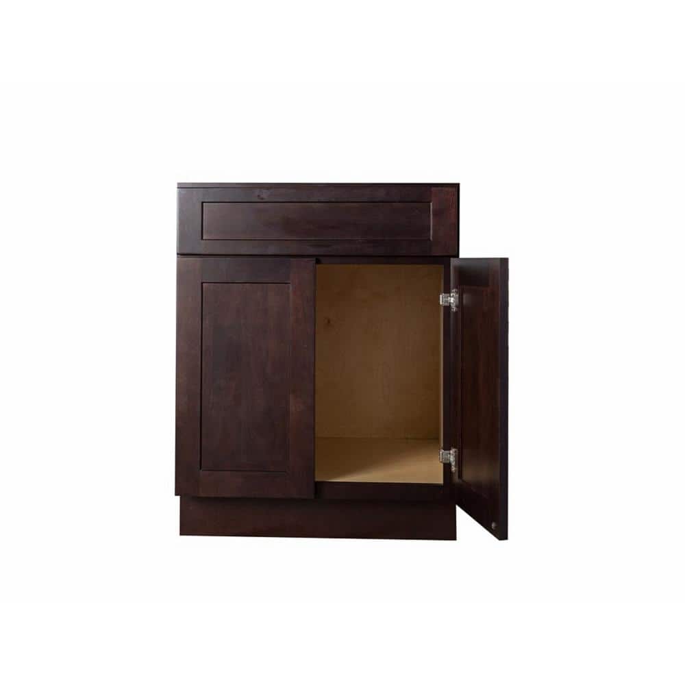 Transform your kitchen with the Bremen Ready-to-Assemble Shaker Sink Base Cabinet. Featuring a rich espresso finish, this cabinet offers a modern, elegant touch with durable hardwood and plywood construction. Enjoy seamless operation with its soft-close door feature and appreciate its timeless style and durability.