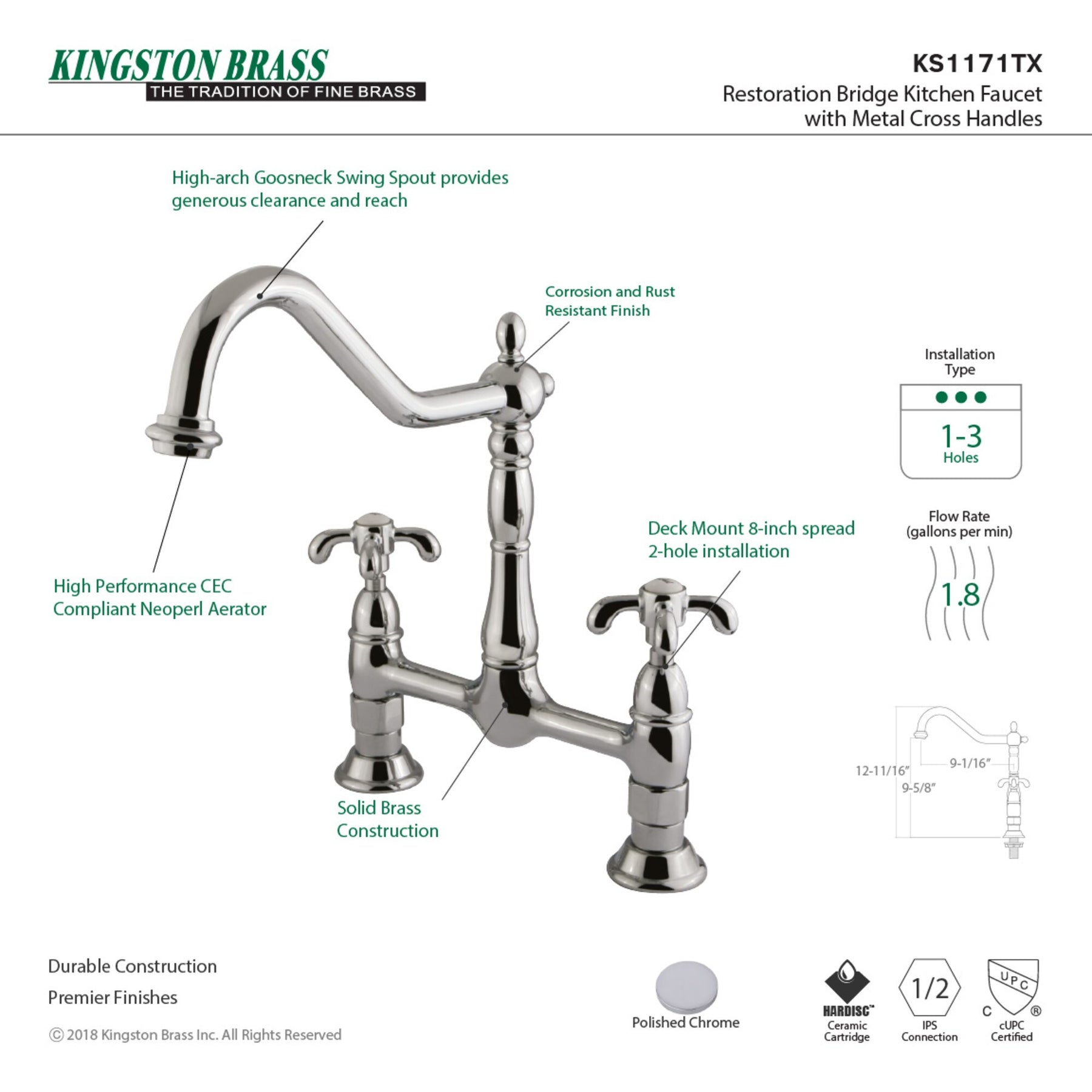 A classic bridge-style kitchen faucet in polished chrome, built from solid brass for lasting durability. Ceramic disc valves deliver smooth, drip-free operation with a high-arch gooseneck spout for generous clearance.