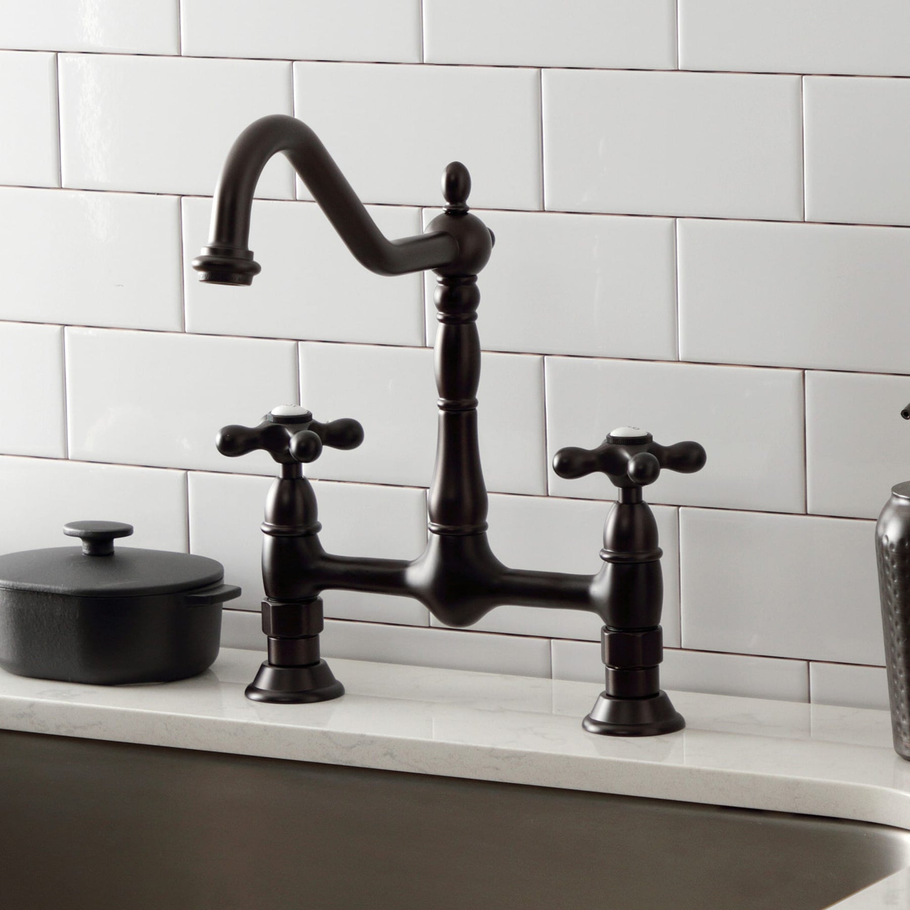 A classic bridge-style kitchen faucet crafted from solid brass with an oil-rubbed bronze finish. Features cross handles, a high-arc 360° swivel spout, and ceramic disc valves for smooth, reliable operation.