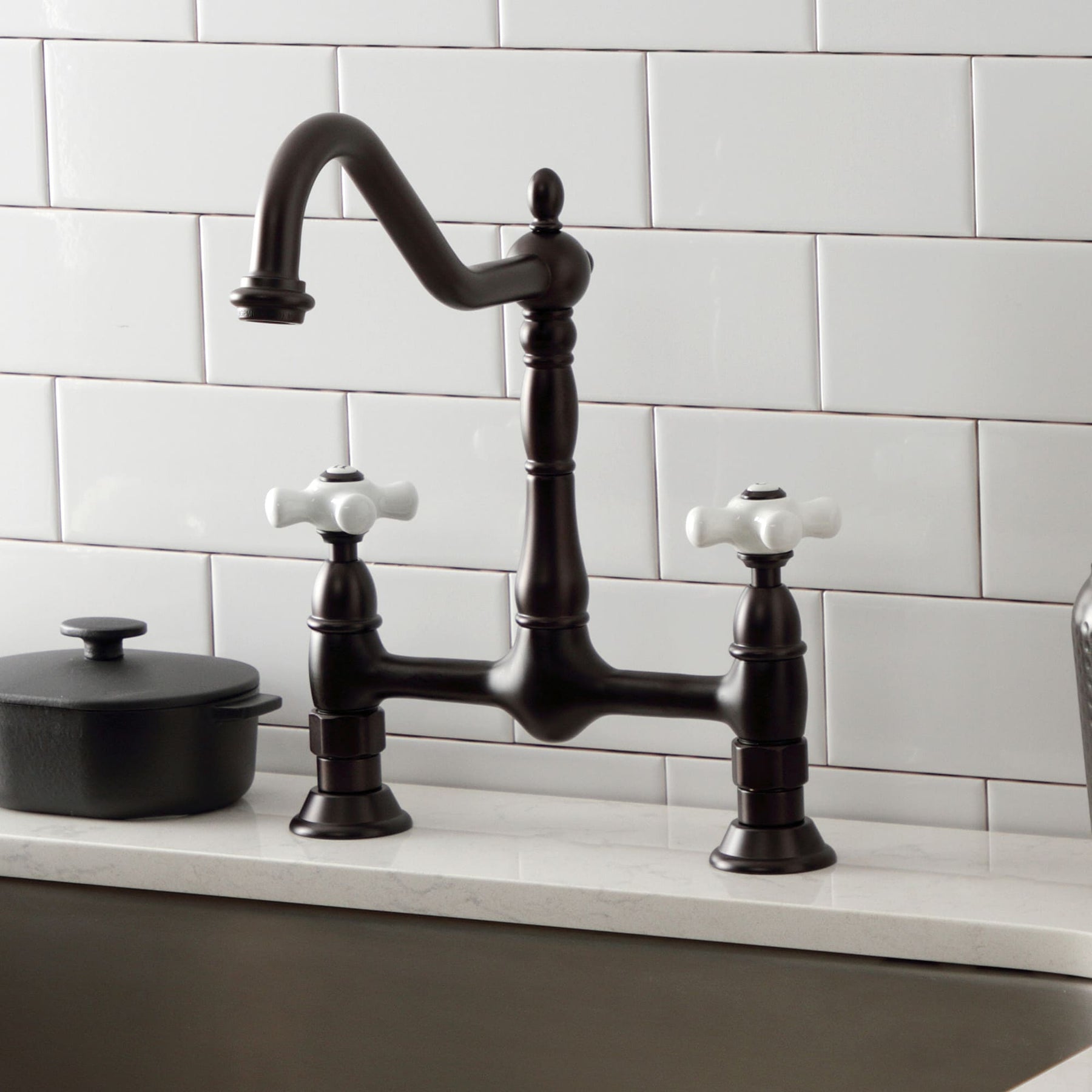 A classic bridge-style kitchen faucet crafted from solid brass with an oil-rubbed bronze finish and porcelain cross handles. The high-arch gooseneck spout swivels 360° for generous clearance, while a ceramic disc valve and removable aerator ensure smooth, reliable performance.