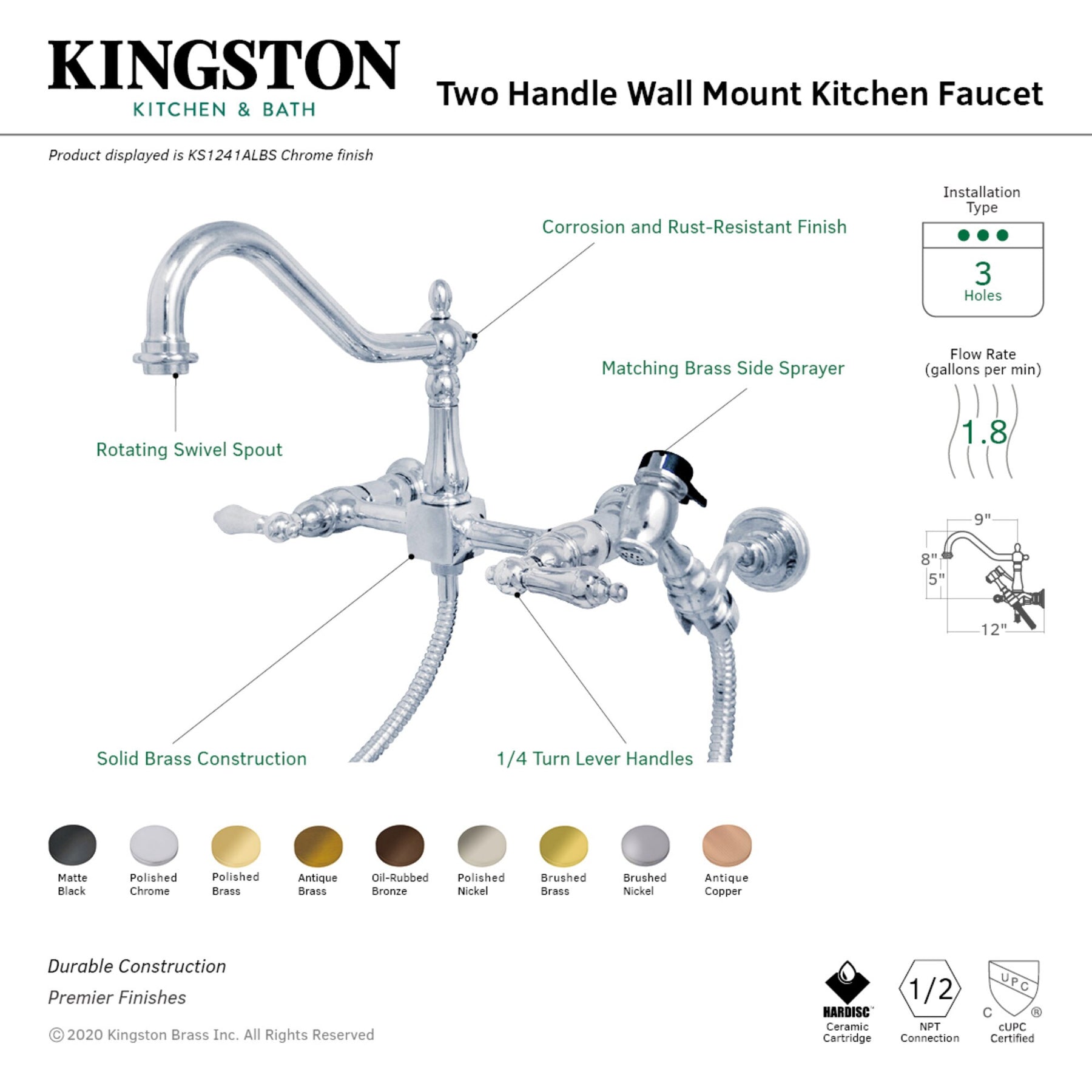 A solid-brass, wall-mount bridge faucet in brushed nickel that brings classic style and modern performance to your kitchen. Dual lever handles with ceramic disc valves deliver smooth 1/4-turn control, while the 360° swivel spout and matching side sprayer add flexible functionality.