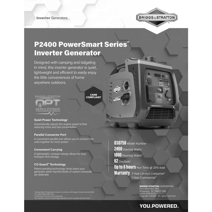 Regular price $699.00The Briggs and Stratton PowerSmart Series 2,400-Watt Gasoline Powered Portable Inverter is perfect for your camping needs and produces clean and instant power to keep appliances and other important electronics powered during trips in your RV. The computer-controlled engine continuously adjusts its speed to your power needs for efficient, consistent and quiet power. The CO Guard carbon monoxide shutdown system down your generator when harmful levels of carbon monoxide accumulate in the generator's operating area. The 2 handle design make it easy to transport and it produces smoother power for sensitive electronics. This generator is equipped with 2 120-Volt household outlets and 1 12-Volt DC accessory battery charging outlet. This unit features an onboard low oil and overload alert system and PowerSmart mode to automatically adjust engine speed to save fuel and run longer. It features a 2-year limited warranty to protect against defects in materials and workmanship. For more than a century, Briggs and Stratton branded engines and power equipment have helped consumers get the job done. Known for hard-working, dependable, efficient products, Briggs and Stratton is the world's largest producer of gasoline engines for outdoor power equipment. Briggs and Stratton products are designed, manufactured, marketed and serviced in over 100 countries on all 7 continents.