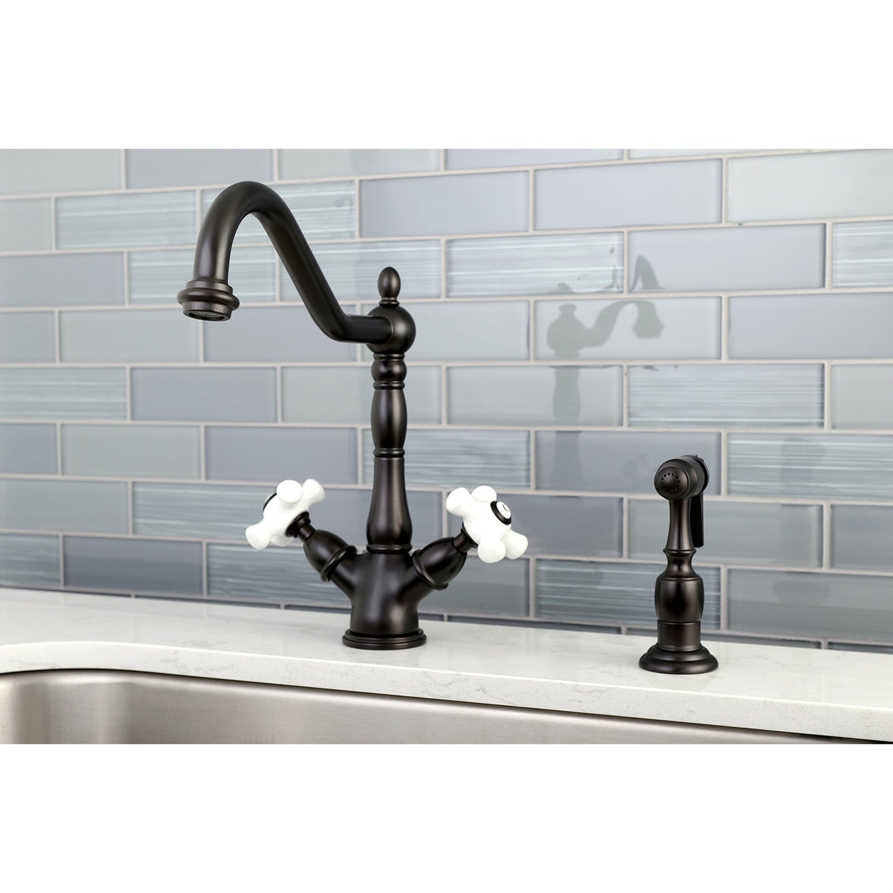 Classic bridge-style kitchen faucet crafted from solid brass with an oil-rubbed bronze finish. Features porcelain cross handles, a high-arc swivel spout, and an included solid-brass side sprayer for versatile cleaning.