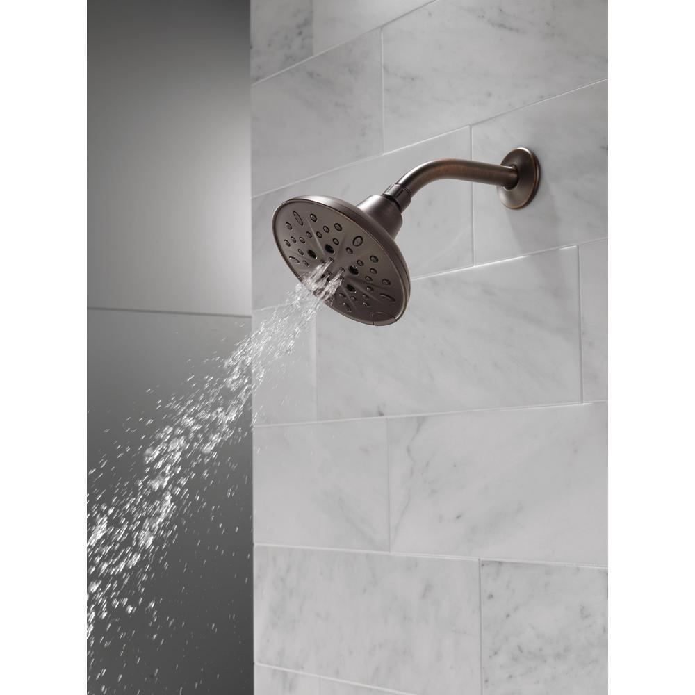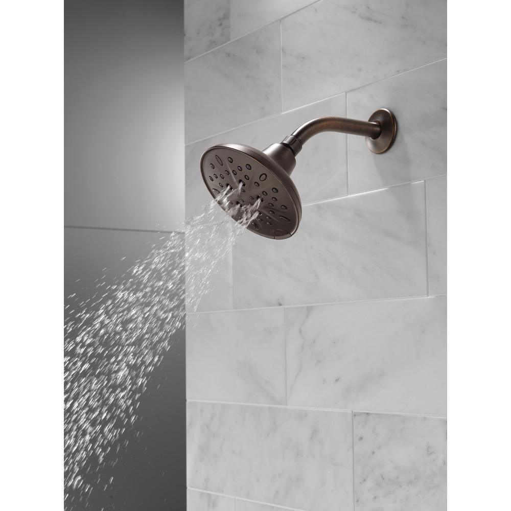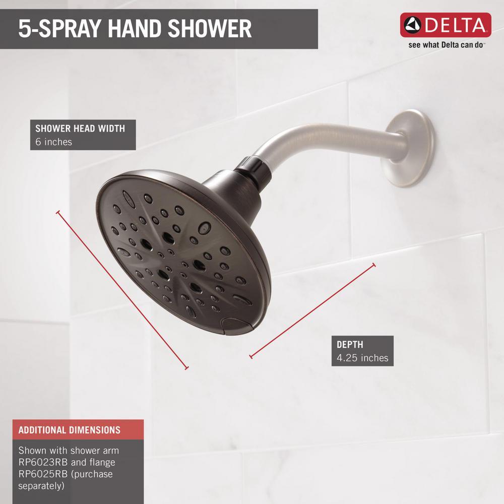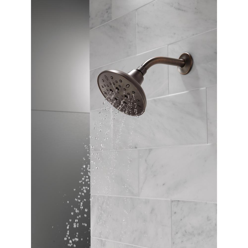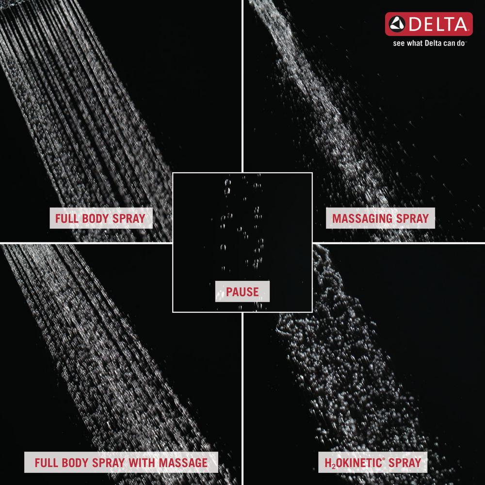 Delta H2Okinetic PowerDrench Showers look different because they are different. H2Okinetic showers are powered by an innovative technology that sculpts the water into a unique wave pattern, giving you the feeling of more water without using more water and creating a shower with more warmth, coverage and intensity. So go ahead and indulge, because now you can enjoy the feeling of more water without using more water. Delta SpotShield Technology helps to keep your faucet or shower cleaner, longer by resisting water spots and fingerprints. Keep your space spotless with SpotShield Technology, available across a variety of finishes for the kitchen and bath. While other products may gather unsightly mineral build-up over time, Delta soft rubber Touch-Clean spray holes allow any mineral residue to simply be wiped away for an instantly refreshed look with no need for soaking or the aid of chemical cleaners. The pause setting gives you ample space for shaving, lathering and other shower tasks, without worrying about overspray or water waste. This spray setting helps you conserve water, so you can worry less about depleting your supply of hot water - and you help the environment too. Delta WaterSense labeled faucets, showers and toilets use at least 20% less water than the industry standard saving you money without compromising performance.