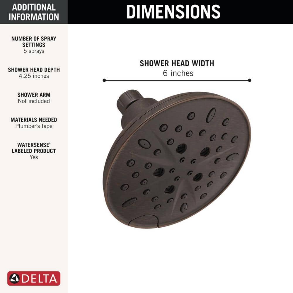 Upgrade your bath with Delta’s 6 in. fixed shower head featuring H2Okinetic technology for a drenching feel using only 1.75 GPM. The SpotShield Venetian Bronze finish resists water spots and fingerprints, while Touch-Clean rubber spray holes make maintenance effortless.