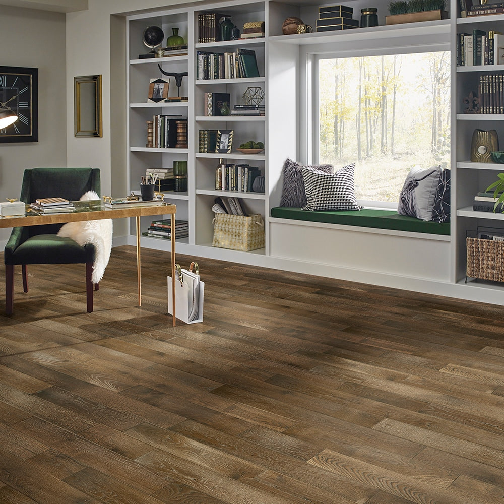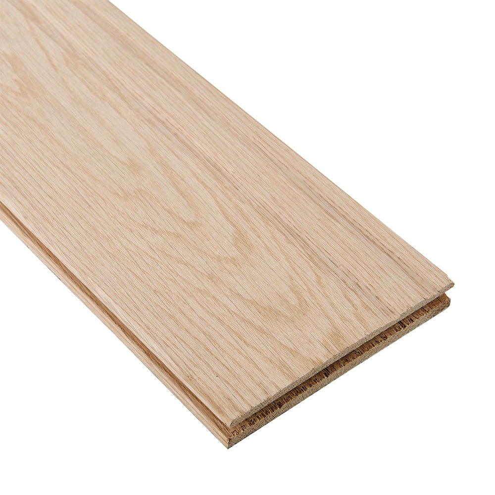 This medium brown red oak flooring, adorned with wirebrushed textures, transforms any space into a haven of rustic elegance. Each plank tells a story of craftsmanship with its exposed grains and character-rich finish. Picture it grounding your room with warmth, working beautifully alongside both modern and traditional aesthetics. Essential for sophisticated living, it’s a canvas that allows you to create your own masterpiece.