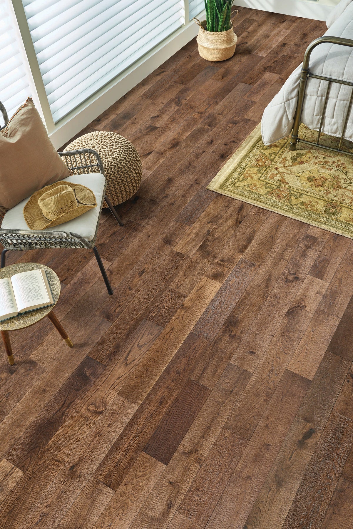 The Deer Valley White Oak flooring by Bruce is a harmonious marriage of rustic allure and modern sophistication. Its rich, dark brown hue and elegantly wirebrushed texture transform any room into a sanctuary of style and comfort. Consider pairing it with lush greenery and minimalist furnishings to let the floor's warm character shine. This flooring is not just a surface underfoot; it's a statement of refined taste and enduring luxury.