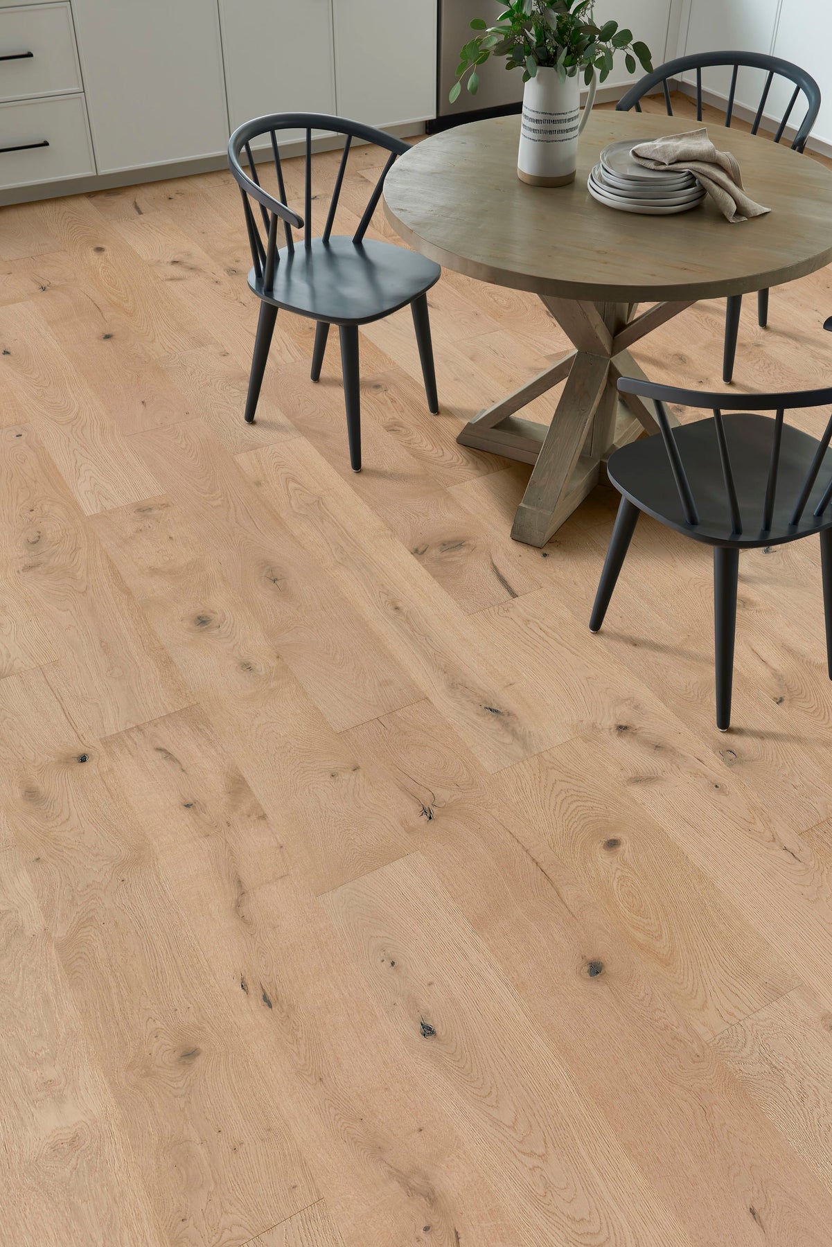 Transform your living space with the sophisticated appeal of Dune Trail White Oak flooring. The gentle wirebrushed texture and subtle light brown hue capture a natural elegance, seamlessly blending with both traditional and modern interiors. Style the flooring with plush area rugs to complement its warmth and enhance its understated beauty. This hardwood floor is an indispensable element of luxurious living, bringing a classic yet contemporary charm to your home.