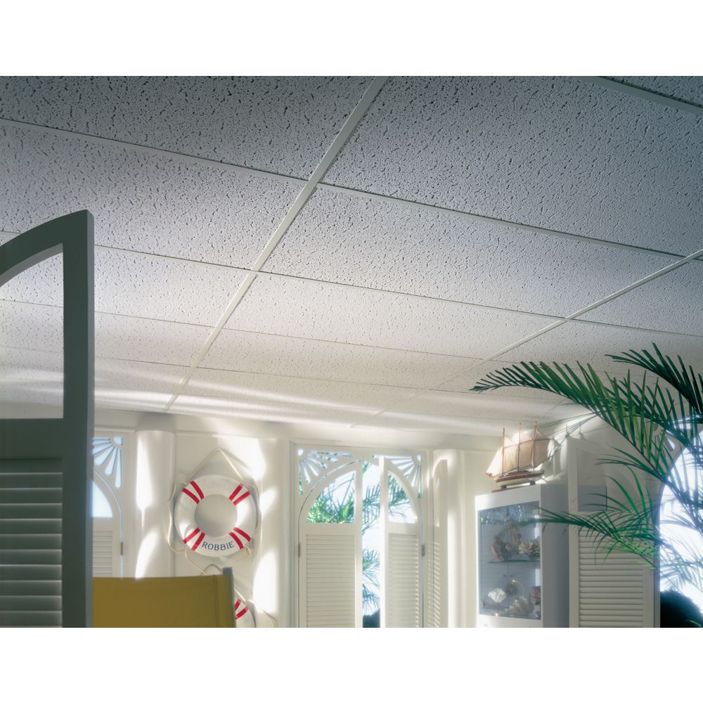 Durable mineral fiber acoustic panels with a classic fissured texture for 15/16-in visible grid systems. Each 4-pack covers 32 sq ft and helps reduce noise while meeting Class A fire rating—ideal for basements, offices, and utility spaces.