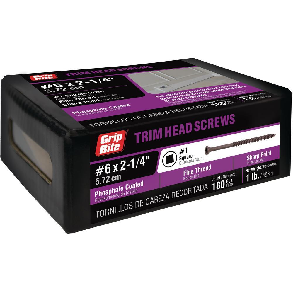 These Grip-Rite trim head drywall screws offer strong, reliable fastening for finish work in drywall. Made of carbon steel with a phosphate coating, they feature a #1 square drive, fine thread, and sharp point for quick starts and clean coverage.