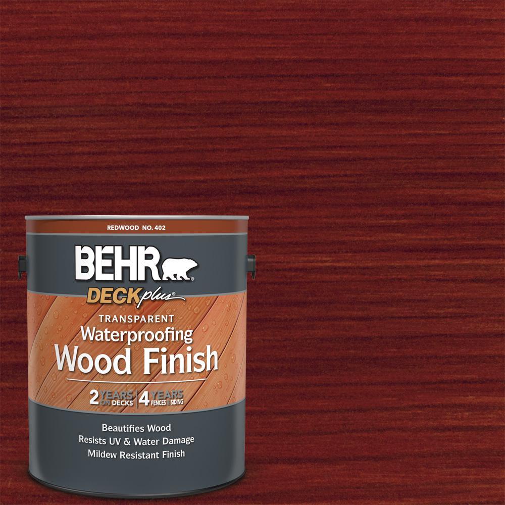 The BEHR DECKplus 1 gal. Redwood Transparent Waterproofing Wood Finish is ideal for decks, fences, siding, and outdoor furniture, where a clear or wood-toned finish is desired. Its penetrating formula with water clean-up provides durability. Also easy application.