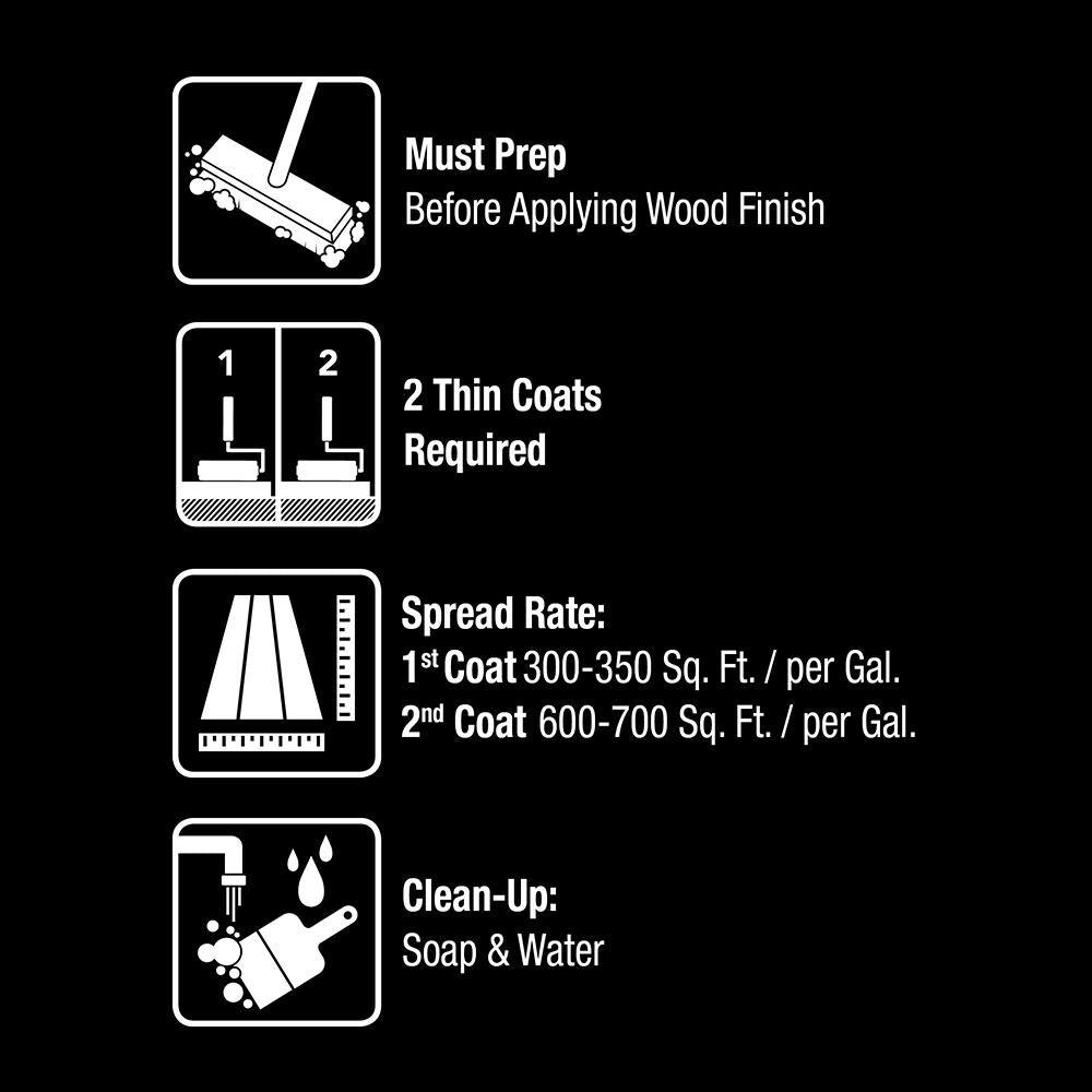 • Coverage area: 1st coat 300-350 sq. ft., 2nd coat 600-700 sq. ft.; avoid applying finish too heavily, two thin coats required