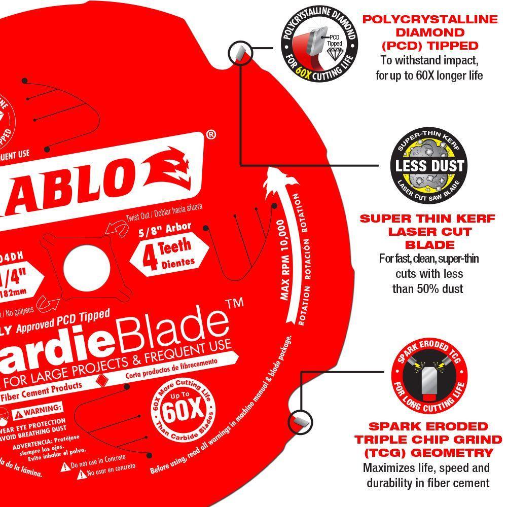 The Diablo 7-1/4 in. x 4-Tooth Polycrystalline Diamond-Tipped Circular Saw Blade features an abrasion-resistant polycrystalline diamond-tipped blade. It was specially formulated to combat the highly abrasive properties of fiber cement products to give you increased cutting life. The Perma-SHIELD non-stick coating protects the blade against heat, gumming and corrosion. This blade was designed to fit all 5/8 in. arbors.