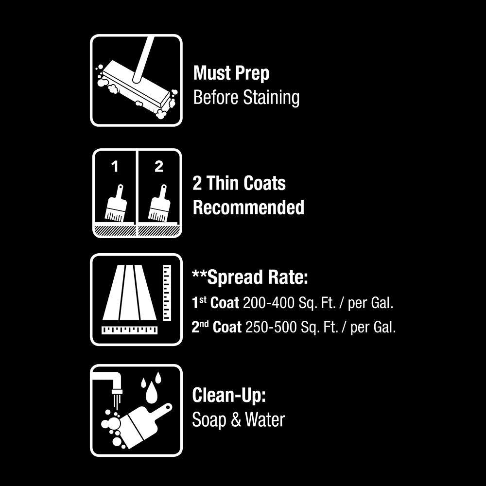 • Coverage area: 1st coat 200-400 sq. ft., 2nd coat 250-500 sq. ft.; avoid applying stain too heavily 2 thin coats recommended