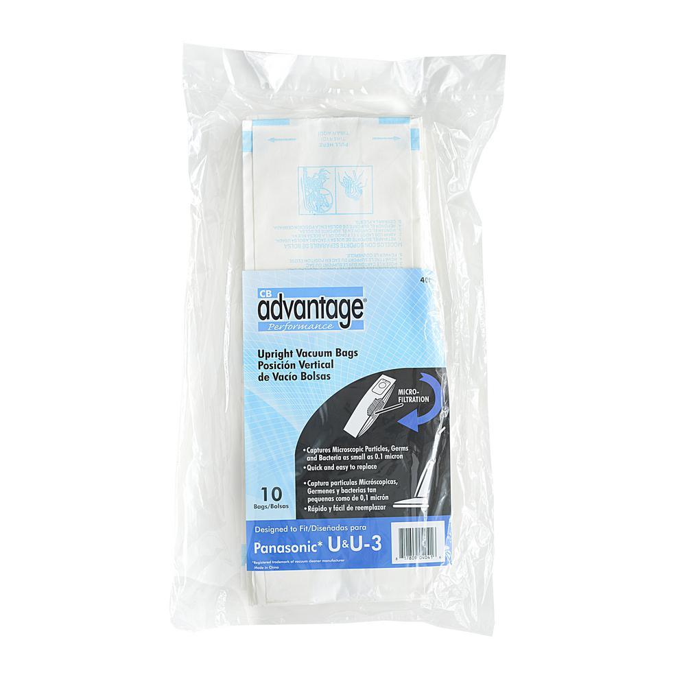Panasonic U, U3 and U6 rreplacement Micro filtration vacuum bags designed to fit Panasonic upright vacuums using Type U, U3 and U6 bags. Advantage brand microfiltration bags are constructed of a strong paper outer layer and fine micro liner that captures microscopic particles. Advantage microfiltration bags are great for allergy sufferers.