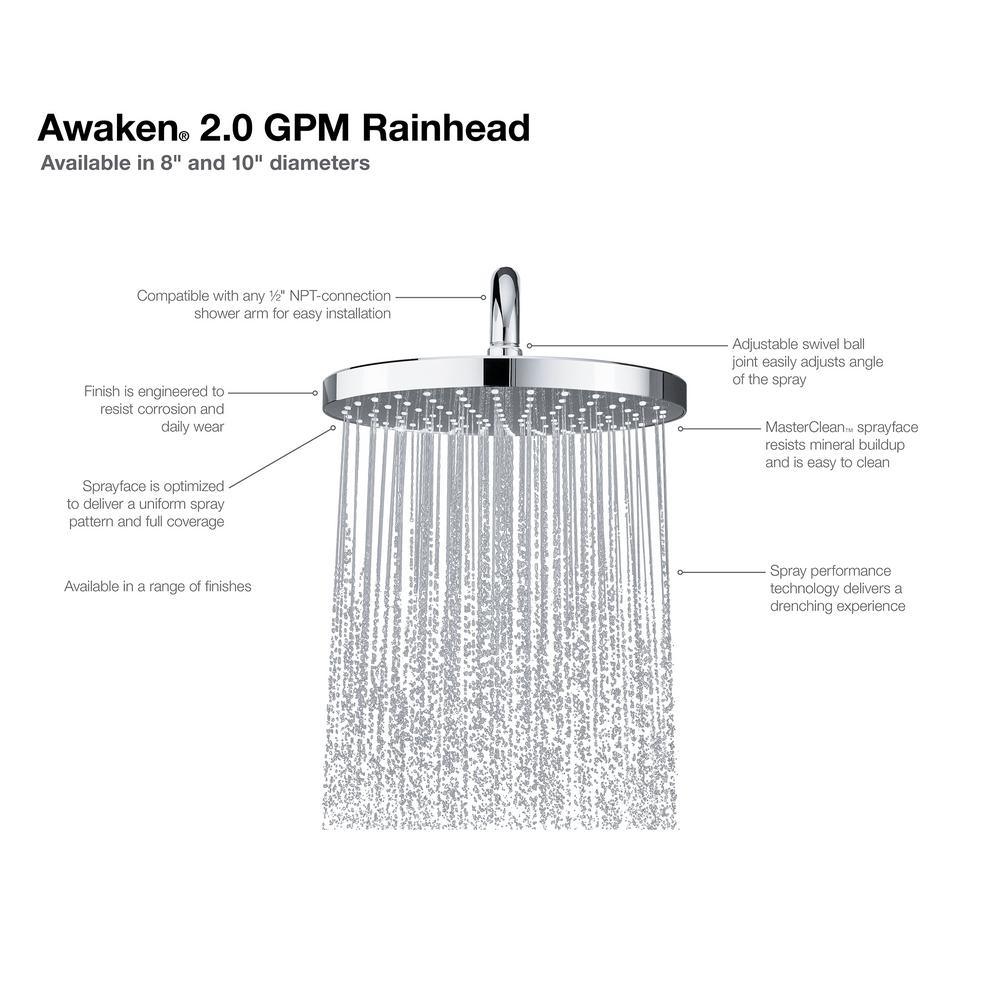Bring the invigorating freshness of a summer rain to your shower with the Awaken Rainhead. An optimized sprayface with angled nozzles generates a uniform spray pattern with wide, even coverage, simulating the experience of walking in a warm Rainshower. The Awaken Rainhead can be installed on a wall- or ceiling-mount shower arm, and a swivel joint allows for precise placement of the spray. Its simple and contemporary design complements the Awaken collection.