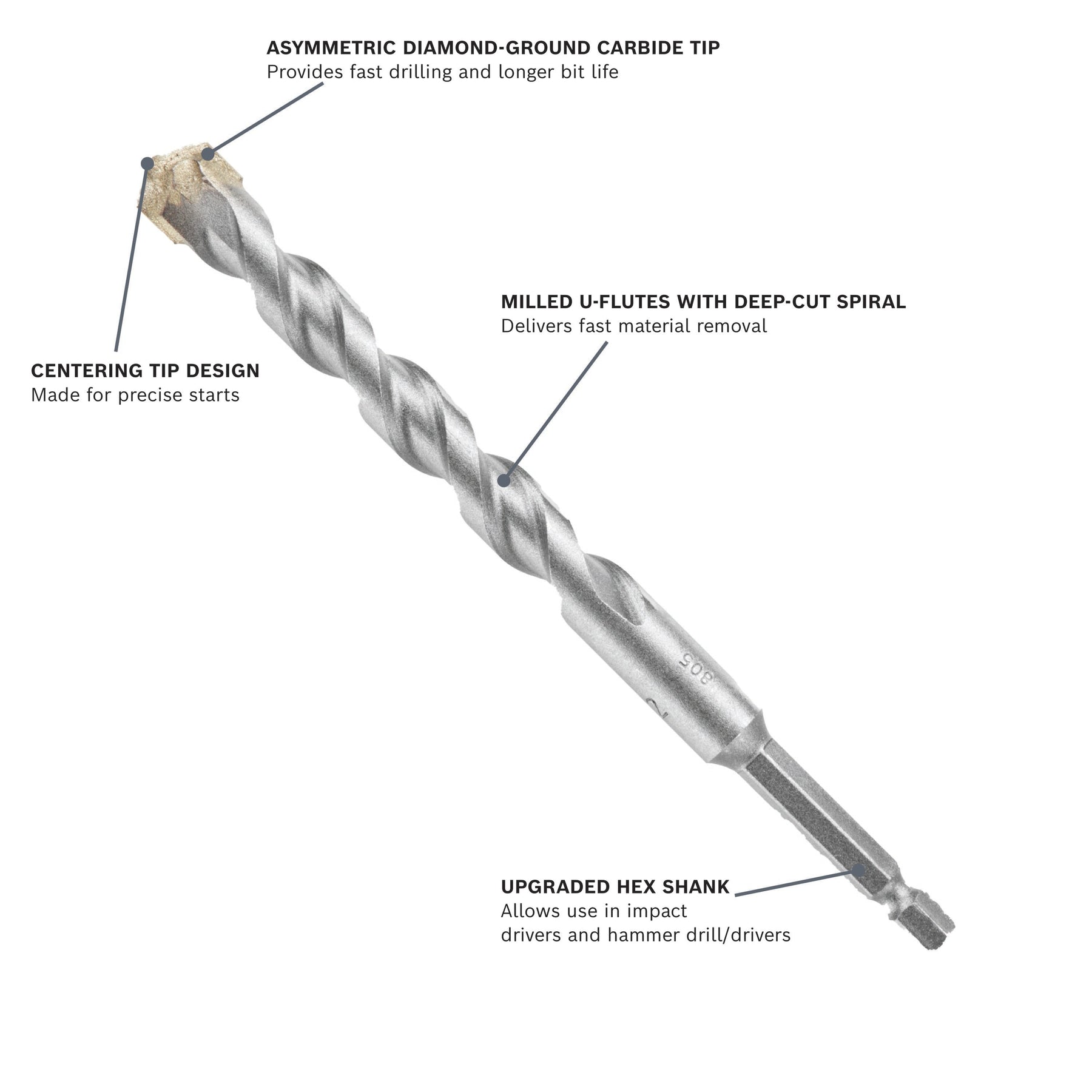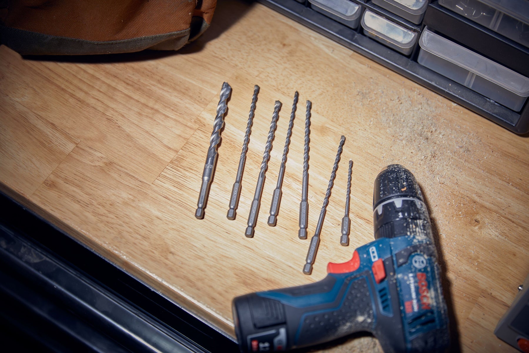 Engineered for block, brick, and concrete, this 7-piece Bosch Impact Tough set features carbide-tipped bits with asymmetric diamond-ground tips for fast drilling and long life. Hex shanks allow use in both hammer drills and impact drivers, while milled U-flutes with deep-cut spirals clear debris quickly.