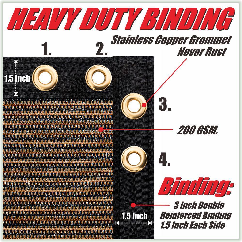 • Reinforcement: Stitched edges with black bindings and brass grommets for strength