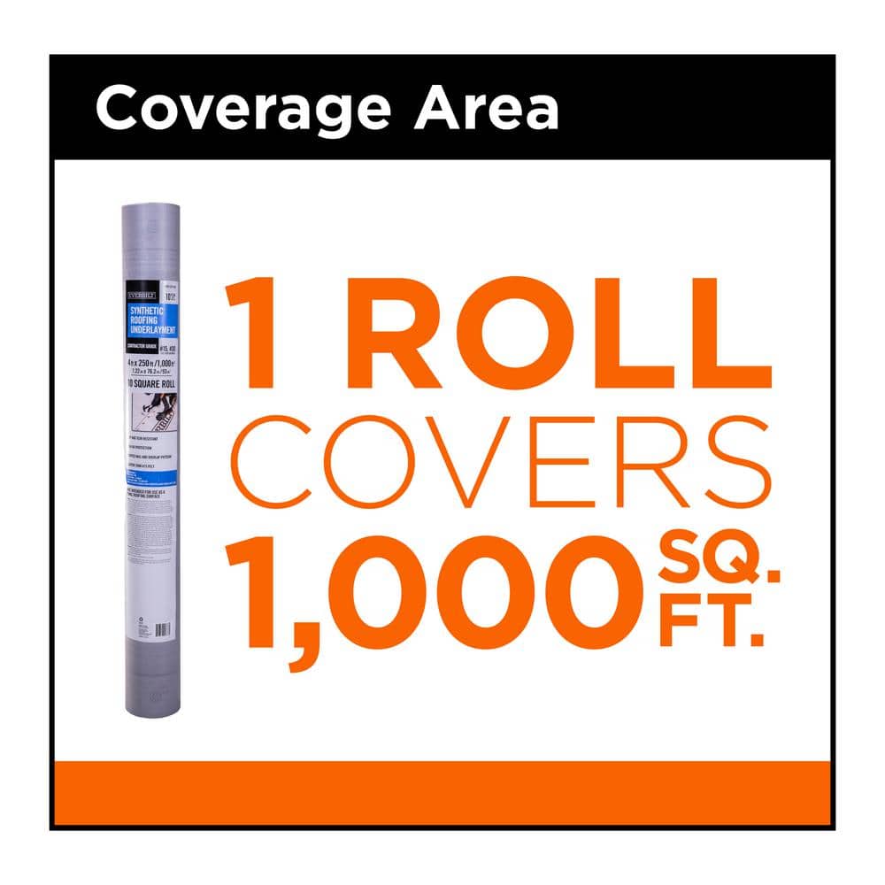 • Ample Coverage: 4 ft. x 250 ft. roll covers 1,000 sq. ft. (10 squares)
