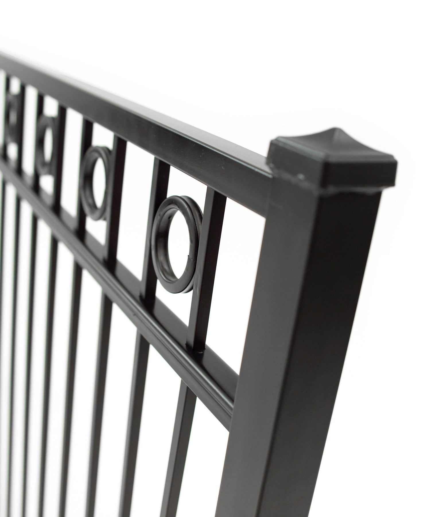 A: The gate is designed to match Deco panel and post dimensions. Posts are sold separately and can be fitted with either flat or ball caps for a complete look.