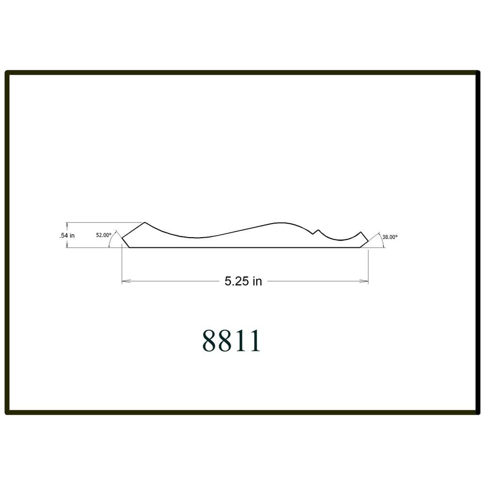 A: The moulding measures 9/16 inch in thickness, 5-1/4 inches in width, and 96 inches in length.