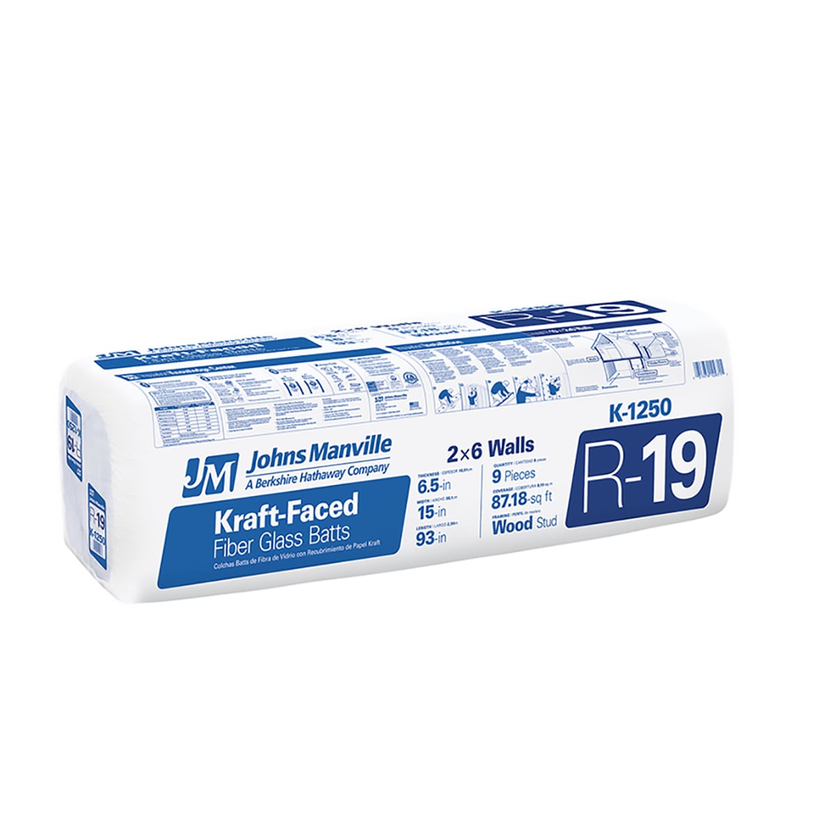 Johns Manville R-19 Kraft-faced fiberglass batts insulate 2x6 wood-stud walls with built-in vapor retarder for moisture control. Precut 15-in x 93-in batts cover 87.18 sq ft per package and help improve energy efficiency and sound control.