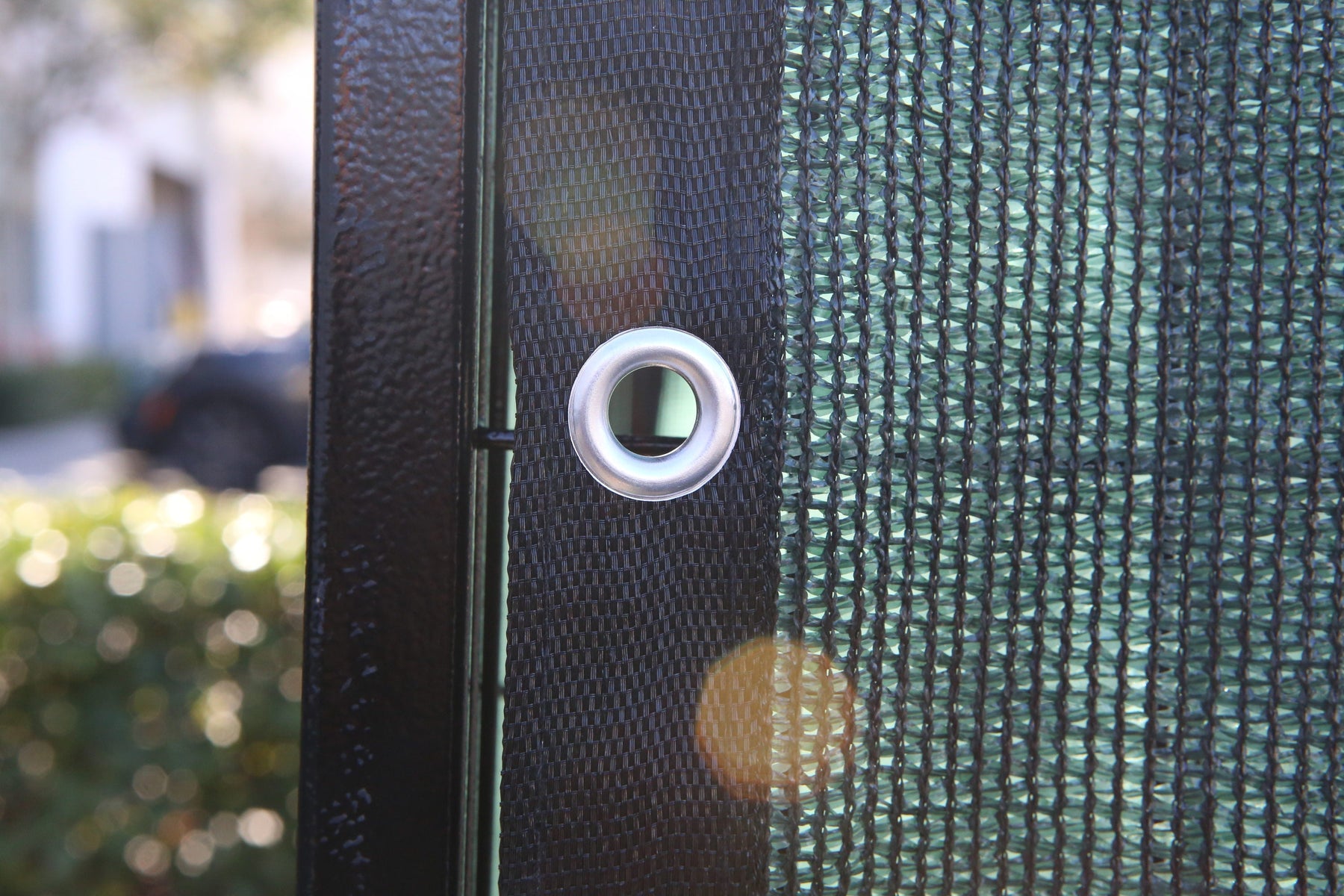 A: The fence screen comes hemmed and bound with metal grommets every 24 inches, making installation straightforward and wrinkle-free.