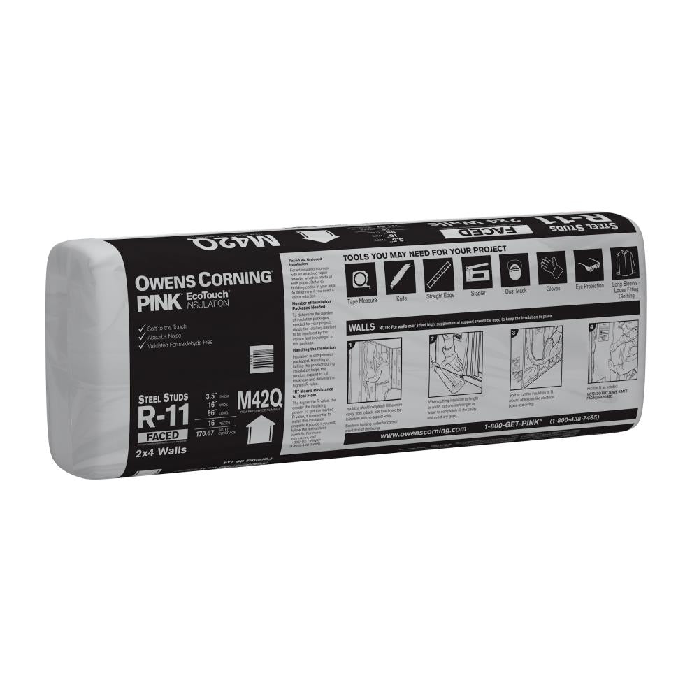 Owens Corning PINK EcoTouch R-11 kraft-faced fiberglass batts deliver thermal and sound control for 2x4 walls. The kraft facing acts as a vapor retarder to help manage moisture while the soft, low-dust fiberglass is easy to install and handle.