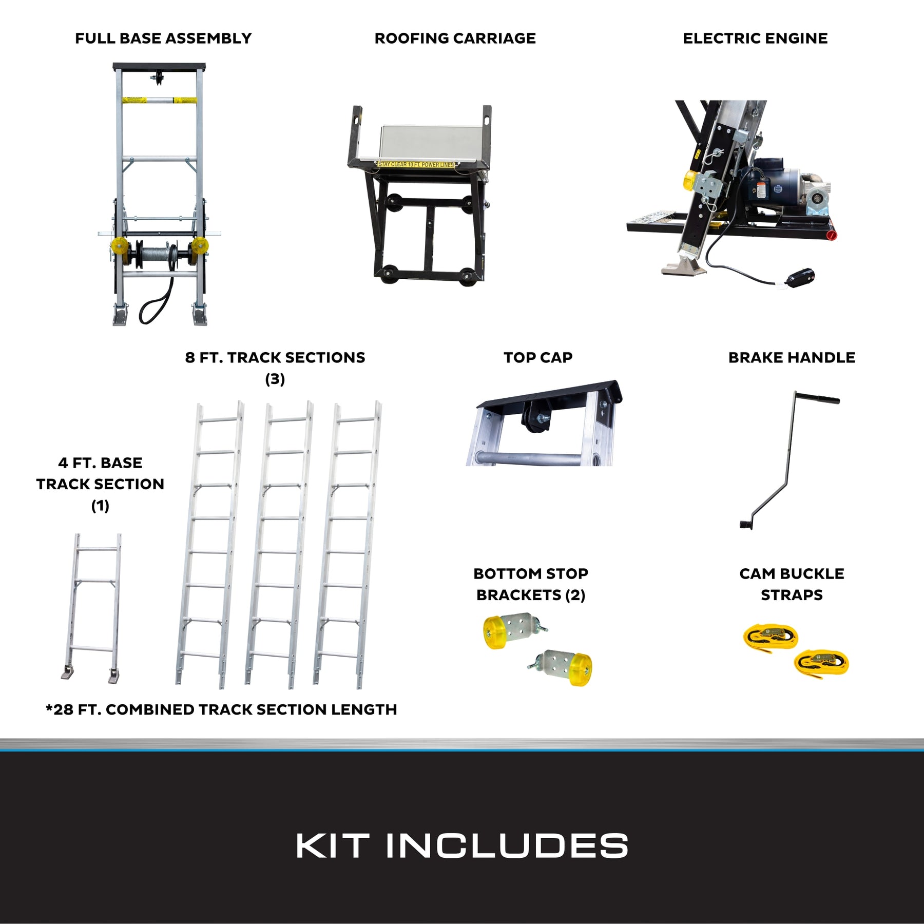 Included Components Electric motor base and cable drum assembly, roofing carriage, brake handle, (3) 8-ft track sections, (1) 4-ft base track section, top cap, bottom stop brackets, cam buckle straps, hardware